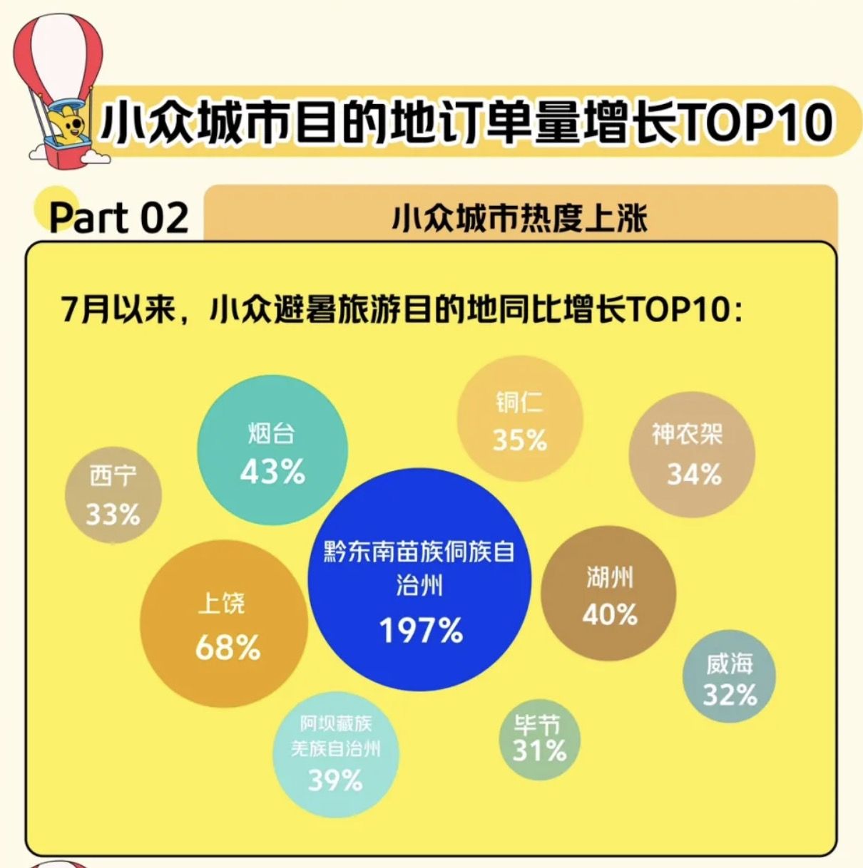 这个夏天,贵州省黔东南苗族侗族自治州以“黑马”姿态强势出圈。近日,美团旅行最新发布的《2025暑期热点及趋势报告》显示,小众避暑旅游目的地同比增长TOP10里,黔东南以197%的文旅热度同比增速,在全国小众避暑目的地中强势领跑,远超江西上饶68%、山东烟台43%、浙江湖州40%等热门地区。