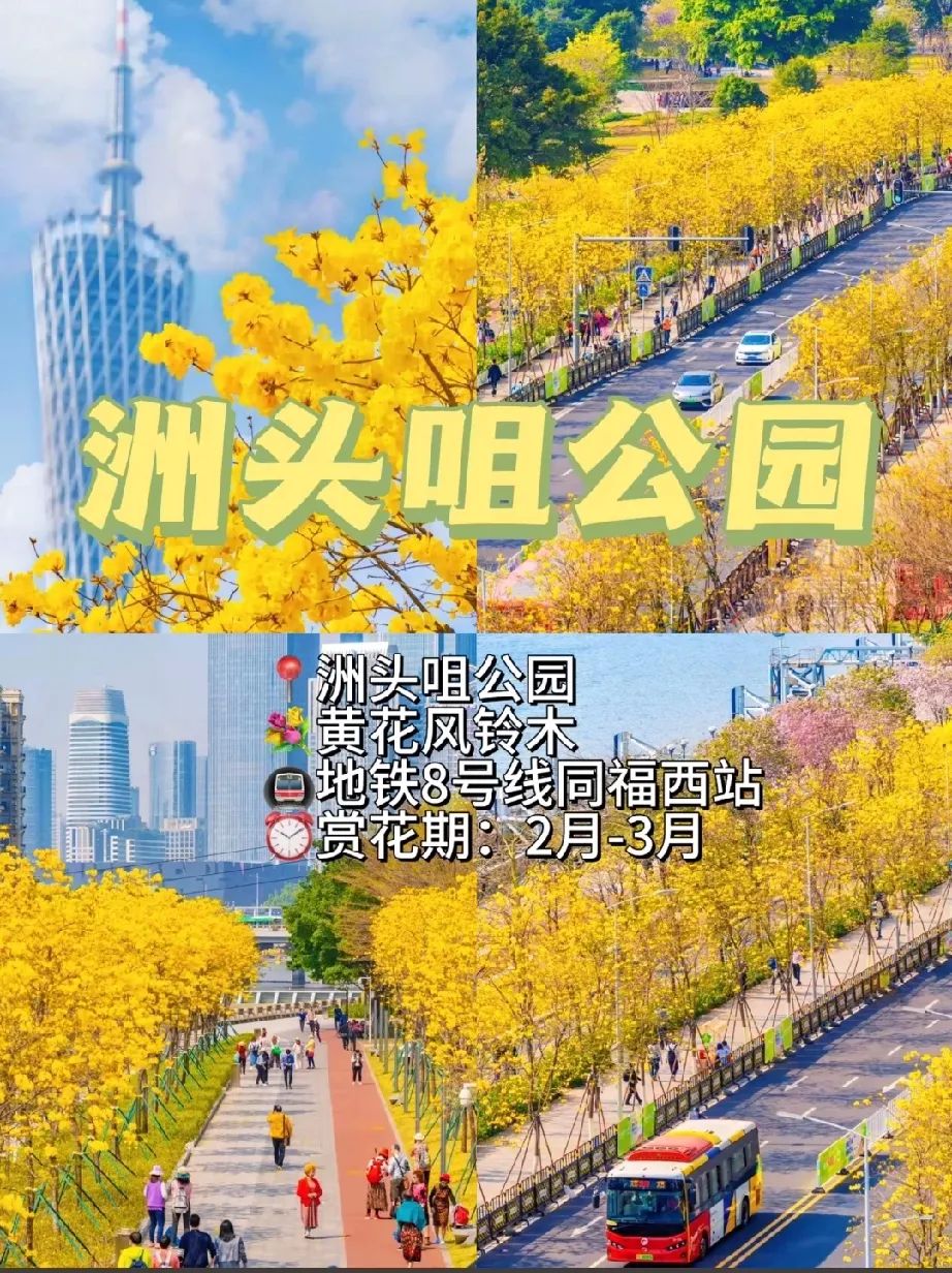 洲头咀环岛路的黄花风铃木正开得旺盛,绵延数百米的金色花海与珠江的碧波相互映衬,就像一幅流动的油画。这里是摄影爱好者的乐园,推荐乘坐989路公交到“洲头咀公园站”,漫步于花径之中感受春日的治愈。