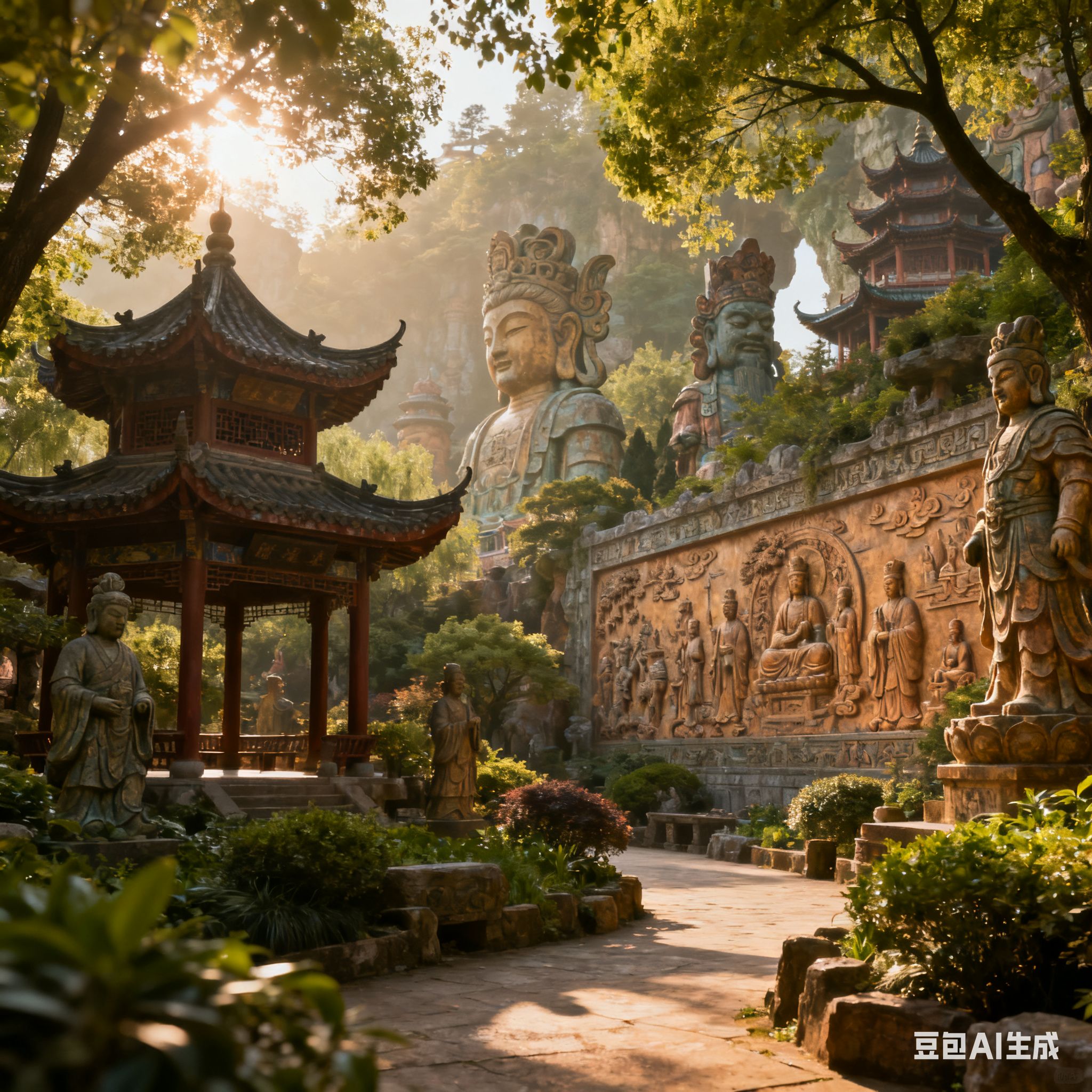 踏入园内,根雕艺术广场便以其独特的魅力震撼着每一位游客的心灵。这里陈列着数以千计的根雕作品,每一件都是大自然与艺术家智慧的完美结合。巨大的树根经过巧妙的雕琢,变成了形态各异的人物、动物和场景。有栩栩如生的历史人物,仿佛从历史的长河中走来,向人们讲述着他们的传奇故事;有活灵活现的飞禽走兽,仿佛随时都会从根雕中跃出,展现出大自然的生机与活力。这些根雕作品不仅造型精美,更蕴含着深刻的文化内涵,让人在欣赏艺术的同时,也能感受到中华文化的深厚底蕴。
