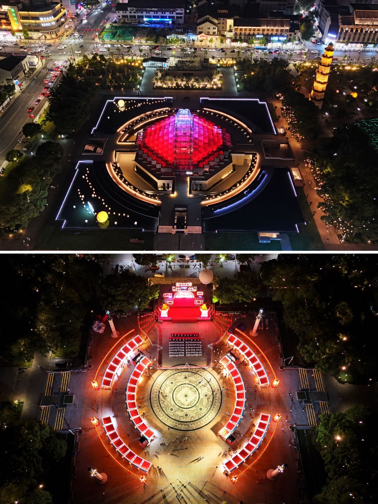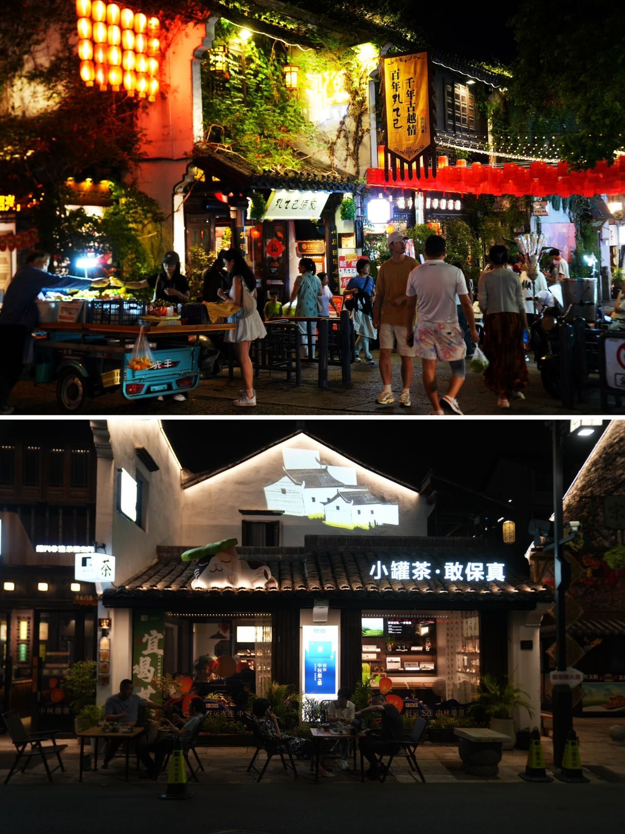 当晚重头戏从城市广场开始,千架无人机表演秀将传统中秋与现代科技完美融合。看完表演直奔迎恩门风情水街,水街流光溢彩。夜晚还可乘游船看灯光秀,在桨声灯影里感受绍兴的醉人夜色。