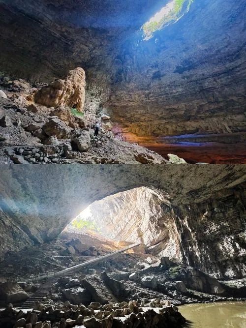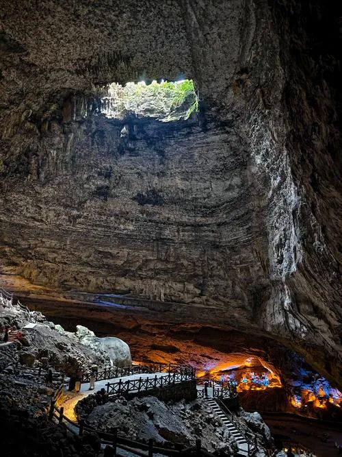- 世界之最:到达直径650米、深208米的喀斯特漏斗,站在观景台的玻璃栈道俯瞰坑底原始森林,航拍视角效果更佳。