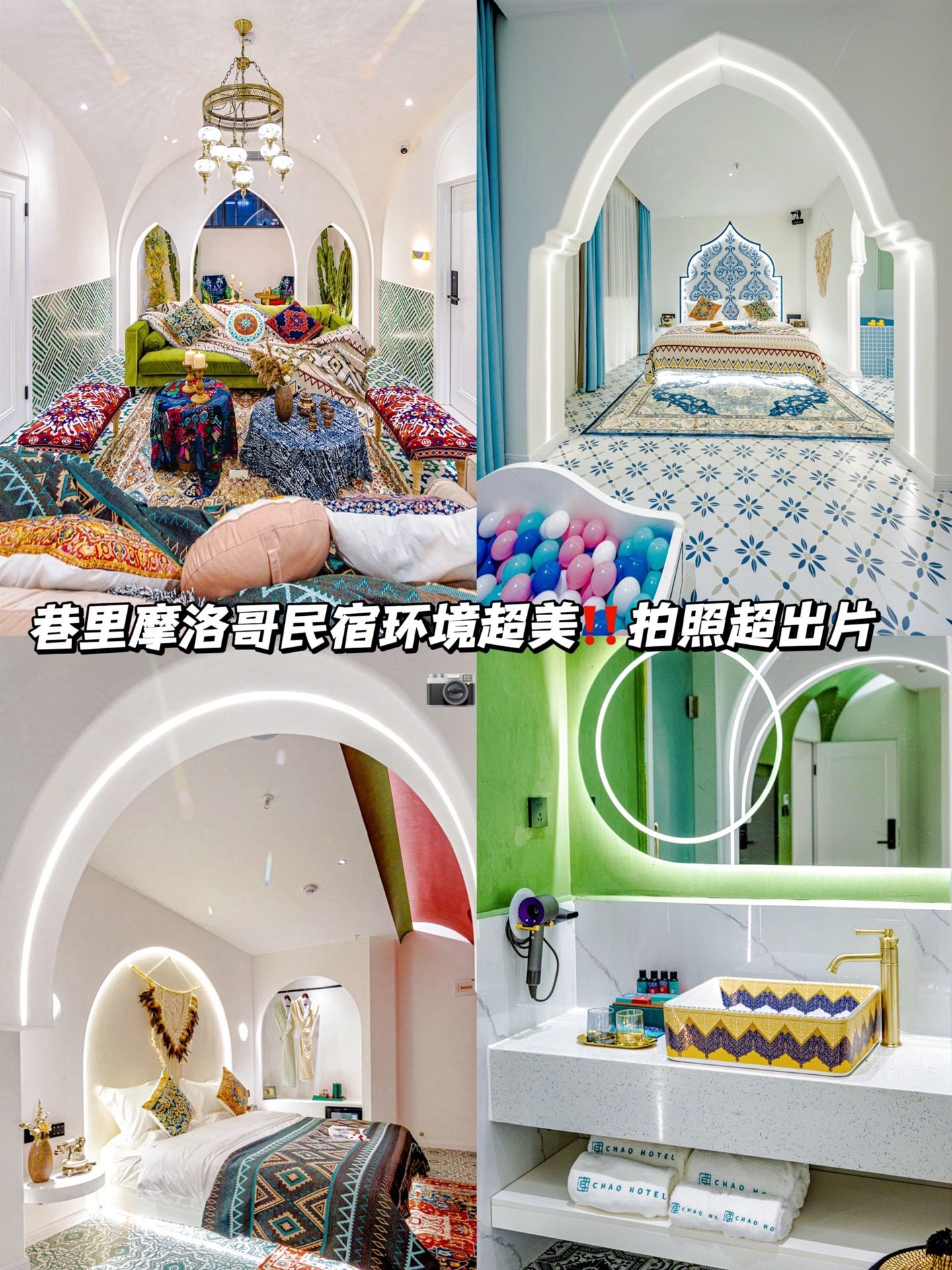 住宿推荐:巷里摩洛哥民宿,距离牌坊街也才400m,这家风格很多!都超好看!还有ins风露台,亲子房电影房还有泡泡池耶!房间好舒服好出片