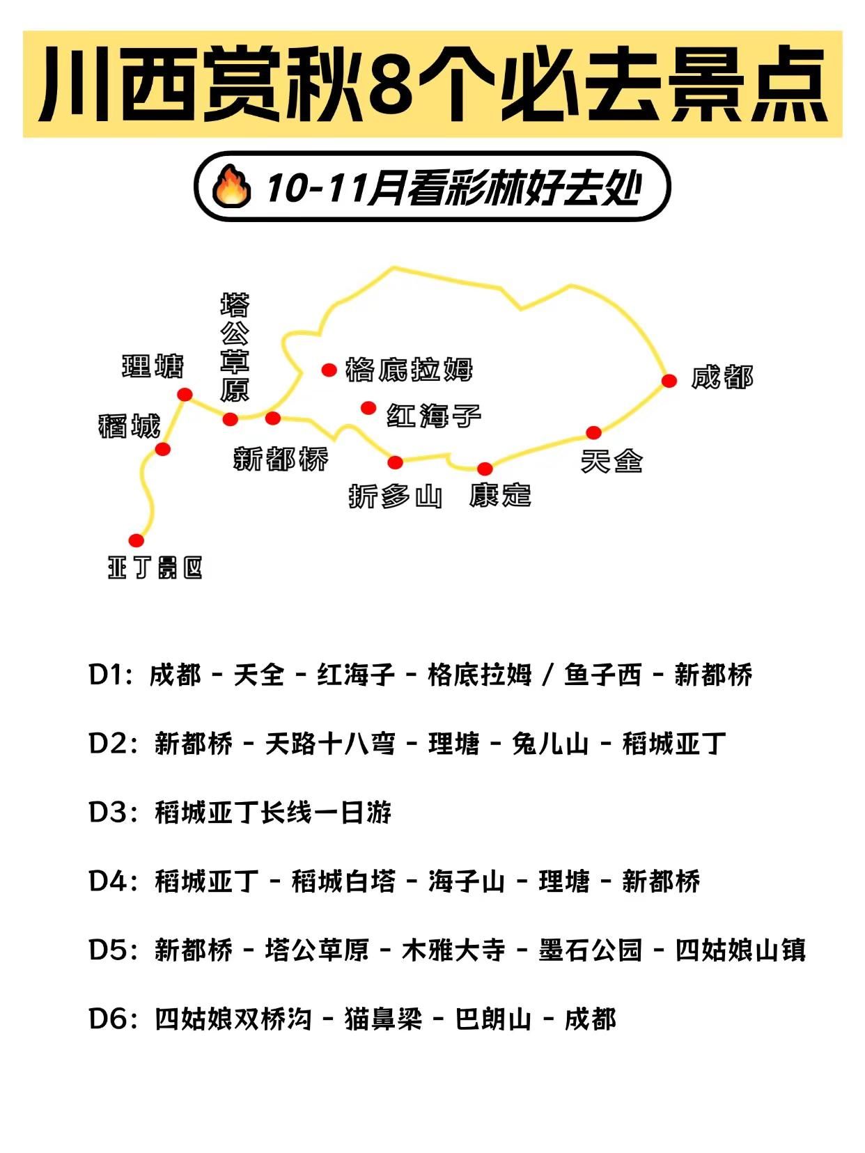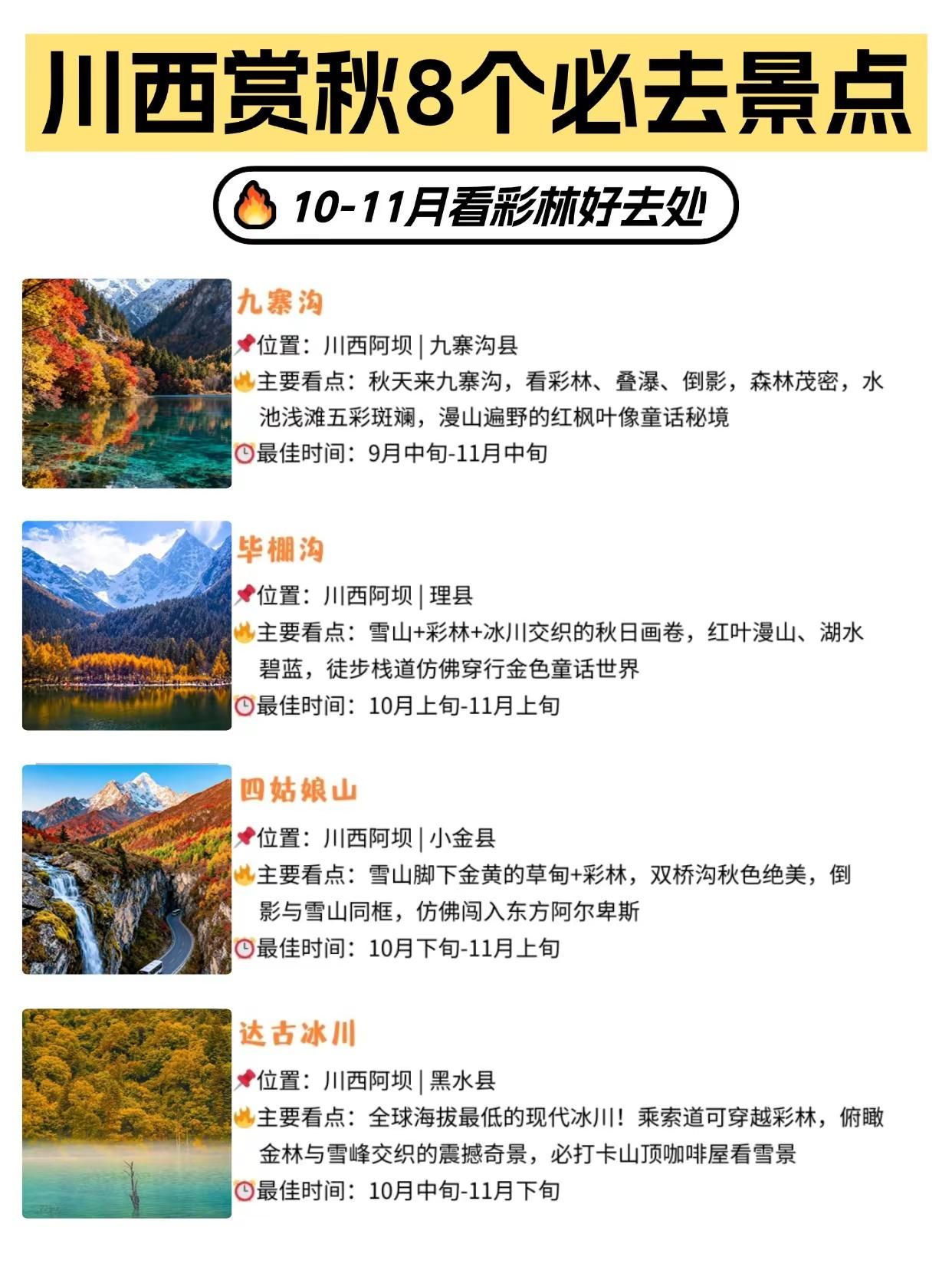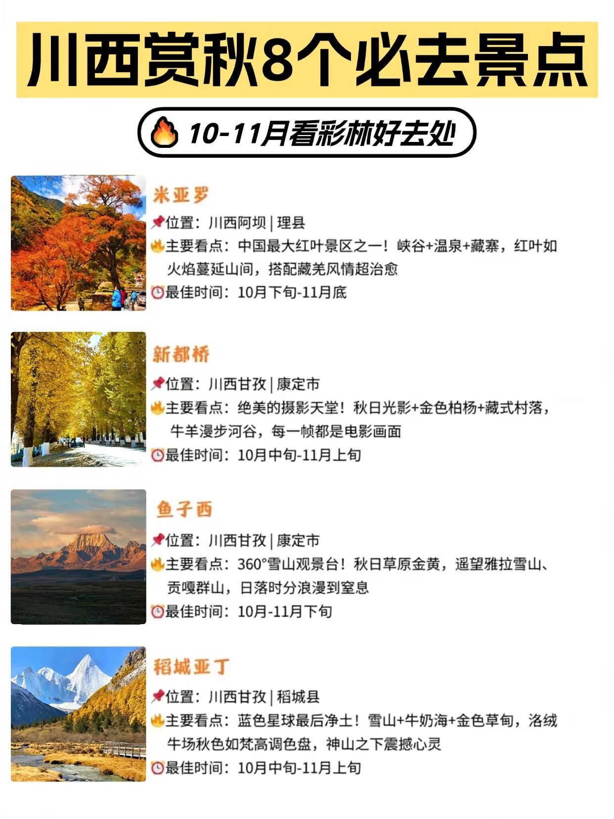 10-11月川西赏秋必冲 8 个彩林景点。10-11 月的彩林盛宴绝不能错过,整理了8 个必去景点 + 6 天路线攻略,收藏好冲就完事儿!8 大赏秋秘境,个个美到窒息1. 九寨沟位置:川西阿坝|九寨沟县看点:彩林、叠瀑、倒影一键拉满!深秋的九寨沟像童话秘境,池水浅滩五彩斑斓,红枫叶漫山遍野,随便拍都是壁纸级别~2. 毕棚沟位置:川西阿坝|理县看点:雪山 + 彩林 + 冰川的神仙组合!红叶漫山、湖水碧蓝,徒步栈道仿佛穿行在金色童话世界,出片率 200%~3. 四姑娘山位置:川西阿坝|小金县看点:雪山脚下金黄草甸 + 彩林绝配!双桥沟秋色绝美,倒影与雪山同框,分分钟闯入东方阿尔卑斯既视感~4. 达古冰川位置:川西阿坝|黑水县看点:全球海拔最低现代冰川!乘索道穿越彩林,俯瞰金林与雪峰交织的震撼奇景,山顶咖啡屋看雪景更是绝绝子~5. 米亚罗位置:川西阿坝|理县看点:中国最大红叶景区之一!峡谷 + 温泉 + 藏寨,红叶如火焰蔓延山间,搭配藏羌风情超治愈~6. 新都桥位置:川西甘孜|康定市看点:摄影天堂名不虚传!秋日光影 + 金色柏杨 + 藏式村落,牛羊漫步河谷,每一帧都是电影画面~7. 鱼子西位置:川西甘孜|康定市看点:360° 雪山观景台!秋日草原金黄,遥望雅拉雪山、贡嘎群山,日落时分浪漫到窒息,露营看星空更是一绝~8. 稻城亚丁位置:川西甘孜|稻城县看点:蓝色星球最后净土!雪山 + 牛奶海 + 金色草甸,洛绒牛场秋色如梵高调色盘,神山之下震撼心灵~6 天川西赏秋路线参考D1:成都 - 天全 - 红海子 - 格底拉姆 / 鱼子西 - 新都桥D2:新都桥 - 天路十八弯 - 理塘 - 兔儿山 - 稻城亚丁D3:稻城亚丁长线一日游D4:稻城亚丁 - 稻城白塔 - 海子山 - 理塘 - 新都桥D5:新都桥 - 塔公草原 - 木雅大寺 - 墨石公园 - 四姑娘山镇D6:四姑娘双桥沟 - 猫鼻梁 - 巴朗山 - 成都川西的秋天短暂又浓烈,错过这波彩林就得等明年啦!快约上小伙伴把川西赏秋提上日程,去沉浸式感受这片金色天堂吧~#川西旅游攻略 #赏秋 #彩林 #九寨沟 #稻城亚丁
