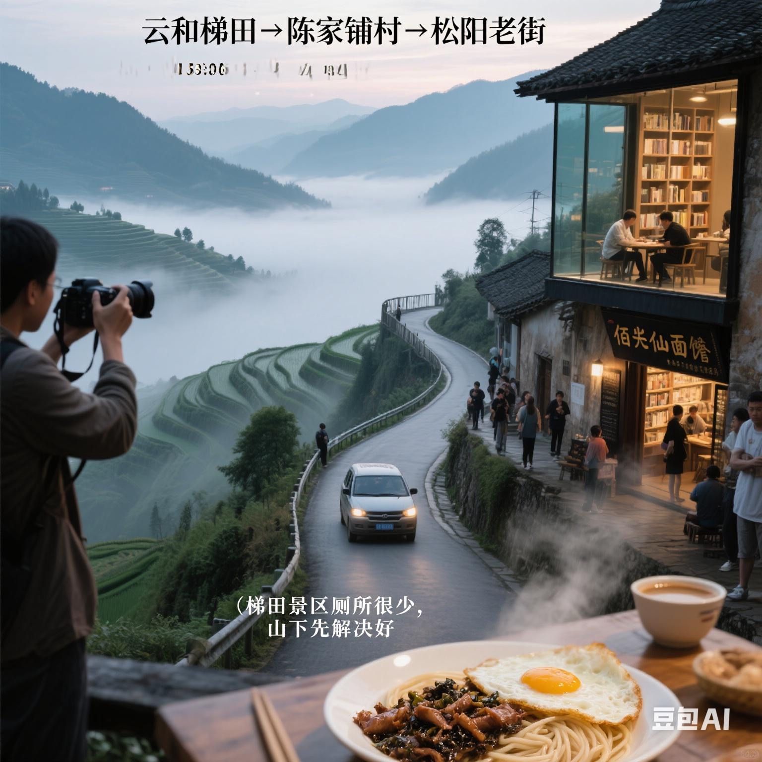 - 5:30 出发云和梯田九曲云环观景台(导航至游客中心换乘景交车,门票80元含缆车)