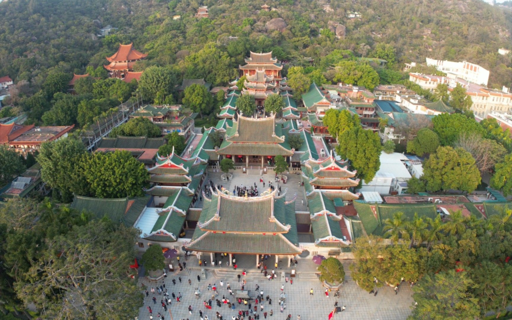 千年古刹香火鼎盛,素饼甜而不腻,五老峰俯瞰双子塔与大海。放生池锦鲤如虹,万寿塔前喂鸽子(免费,赠香处自取)。
