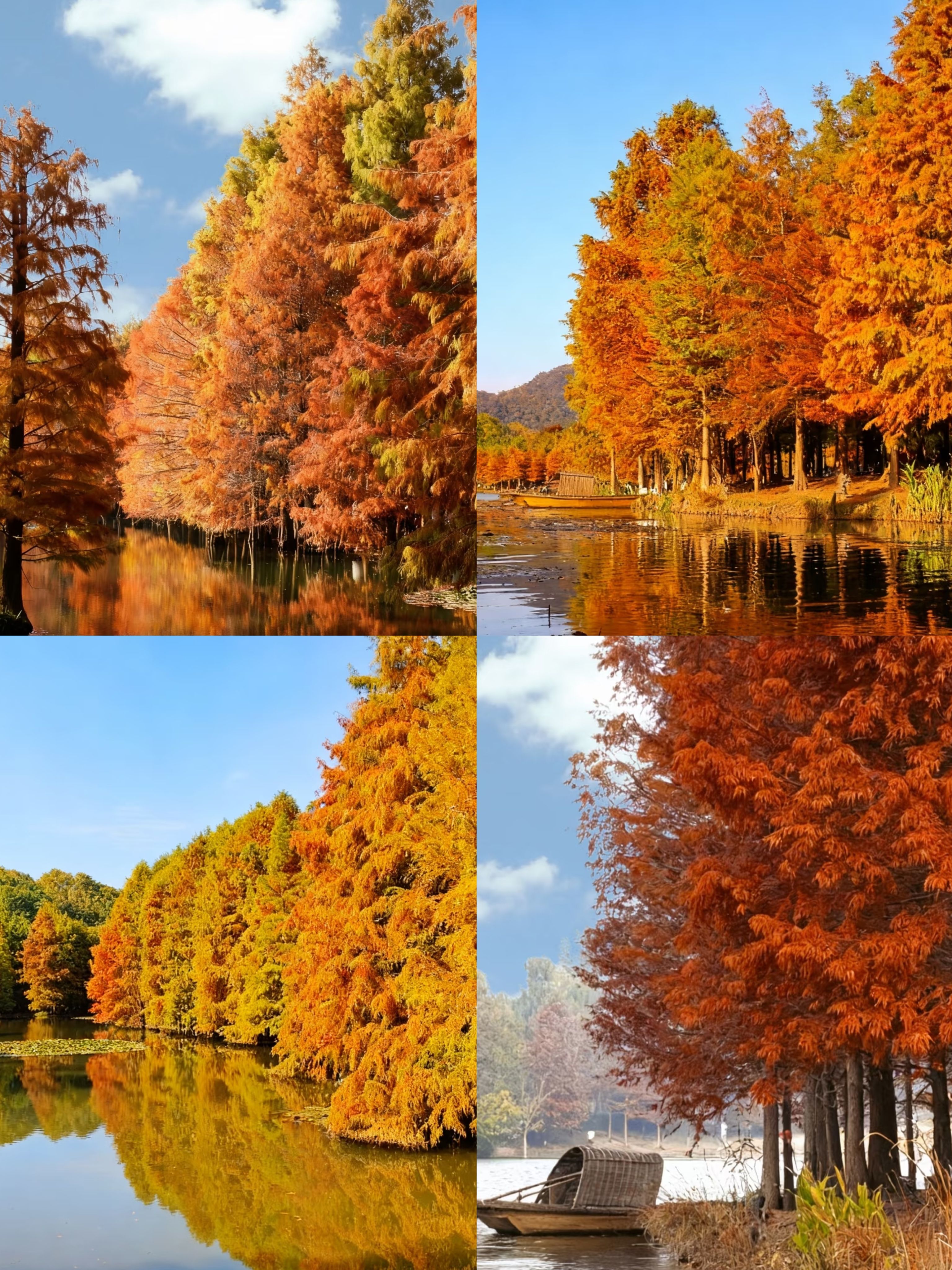 燕雀湖:晨光中的落羽杉渐变如调色盘,湖水像镜子一样倒映着斑斓色彩。