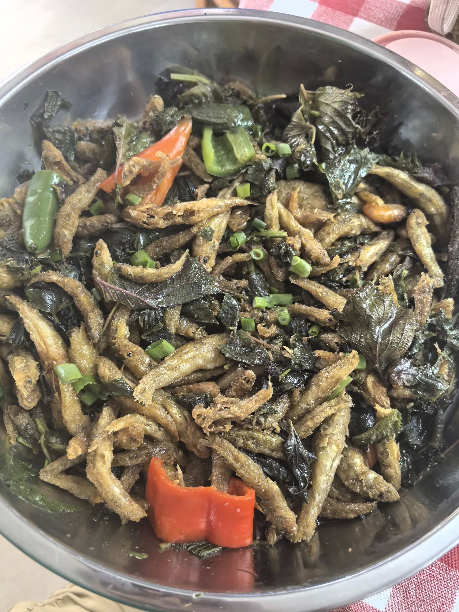 紫苏蒸山坑鱼仔,这道菜非常推荐,这山坑鱼真是一口惊艳了我,虽然是炸过的鱼,但是肉质依然很紧实,搭配紫苏叶独特的香气,对于我这种喜欢吃鱼的人来说,简直太上头了。这道菜的分量也超级大,因为集中火力消灭了韭菜和虾,所以最后这道菜我们打包带走了一部分。