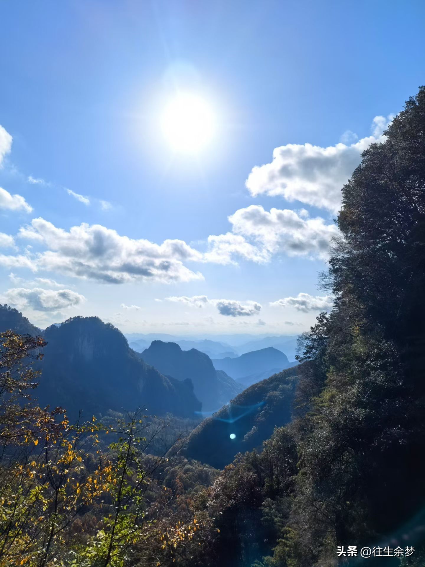 这颜色是鲜活的,有呼吸的。晨起时分,山间缠着一缕缕乳白的薄雾,那斑斓的色彩在水汽里晕染开来,朦朦胧胧,宛如一幅流动的宋人青绿山水。雾气在山间缭绕,如同轻纱般缥缈,让山峦增添了几分神秘的韵味。待到阳光破云而来,万山明净,每一片叶子都像被点亮了,透亮亮的,那色彩仿佛有了温度,直暖到人的心里去。阳光洒在树叶上,折射出五彩的光芒,仿佛给山峦披上了一层金色的纱衣。