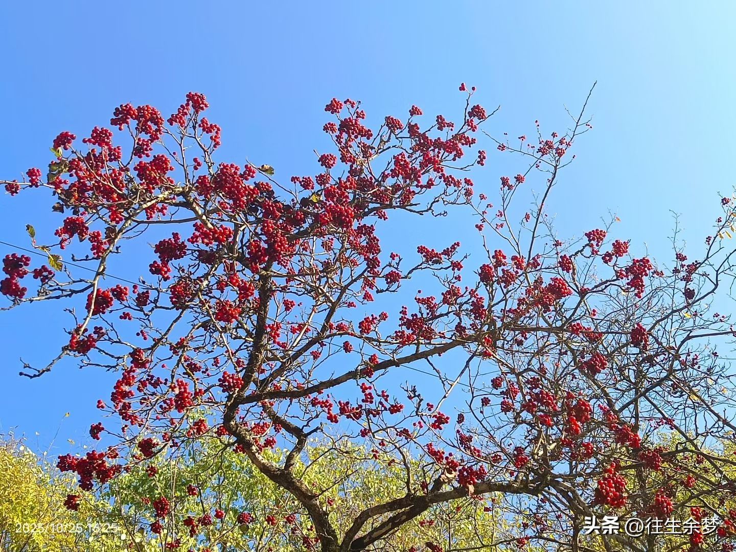 这里的山是这幅画卷中最浓墨重彩的一笔。高远的蓝天宛如一块巨大的蓝色绸缎,而山则是那燃烧的锦绣。绿色并未退场,它谦逊地化作底色,为更秾丽的色彩让出舞台。