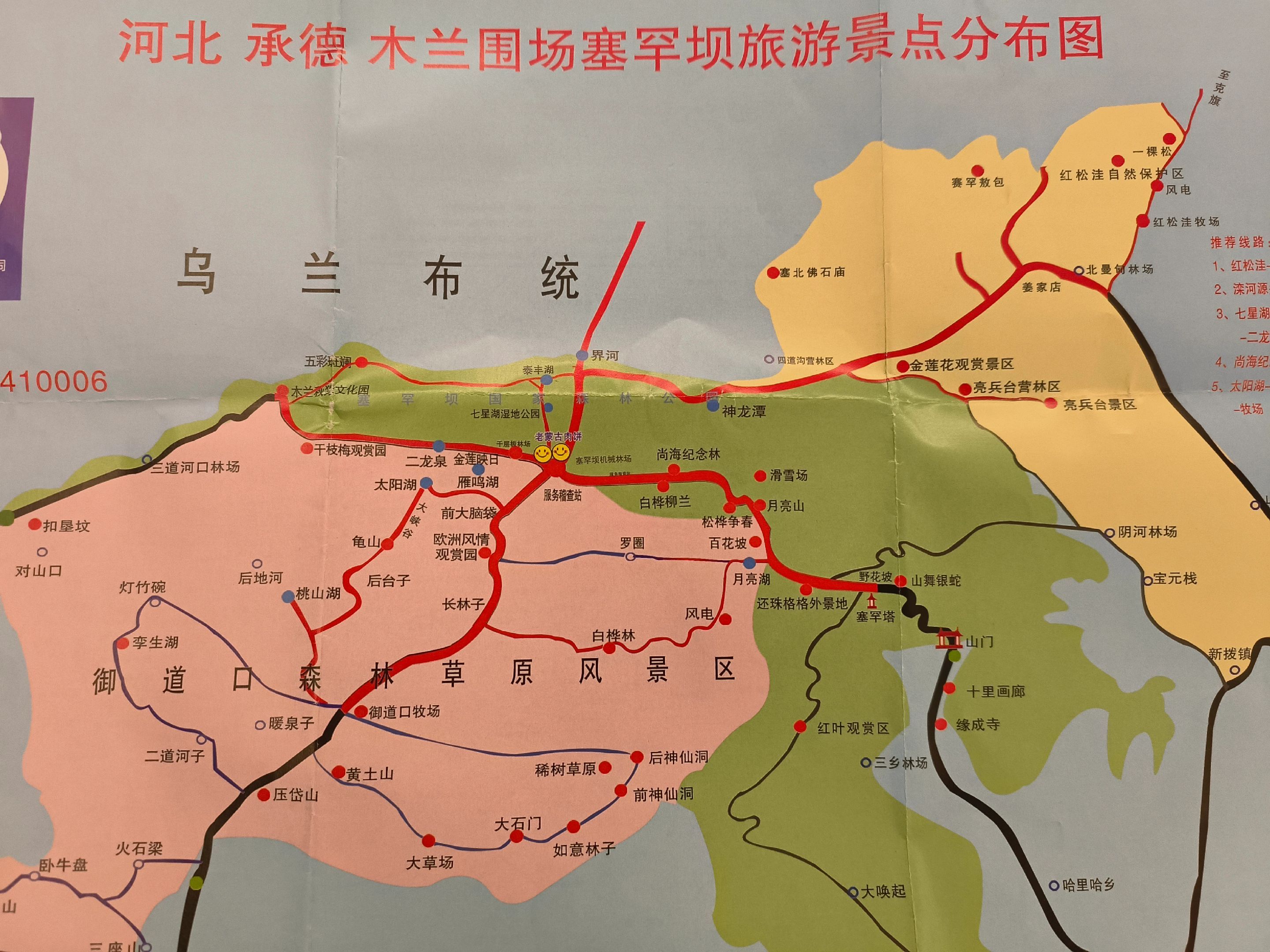 看完得原路返回,回到第一张地图中塞罕坝景区中间最上面的界河点,从这条公路再往北,就正式进入内蒙古地界的乌兰布统景区了,也就是地图中灰色地方。塞罕坝景区西边有个叫“五彩斑斓的景点”也特别漂亮,但是当地人说已经过了花期,所以就没带母亲去。