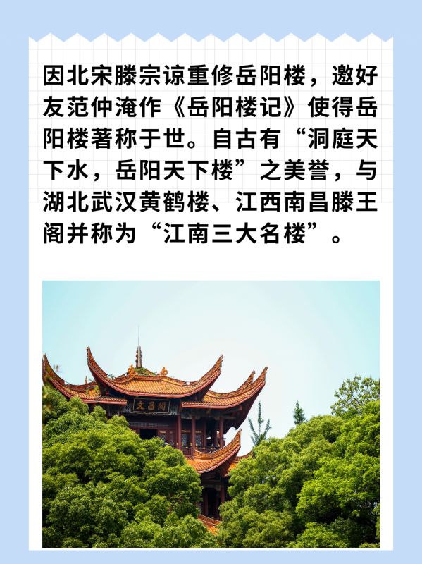因北宋滕宗谅重修岳阳楼,邀好友范仲淹作《岳阳楼记》使得岳阳楼著称于世。