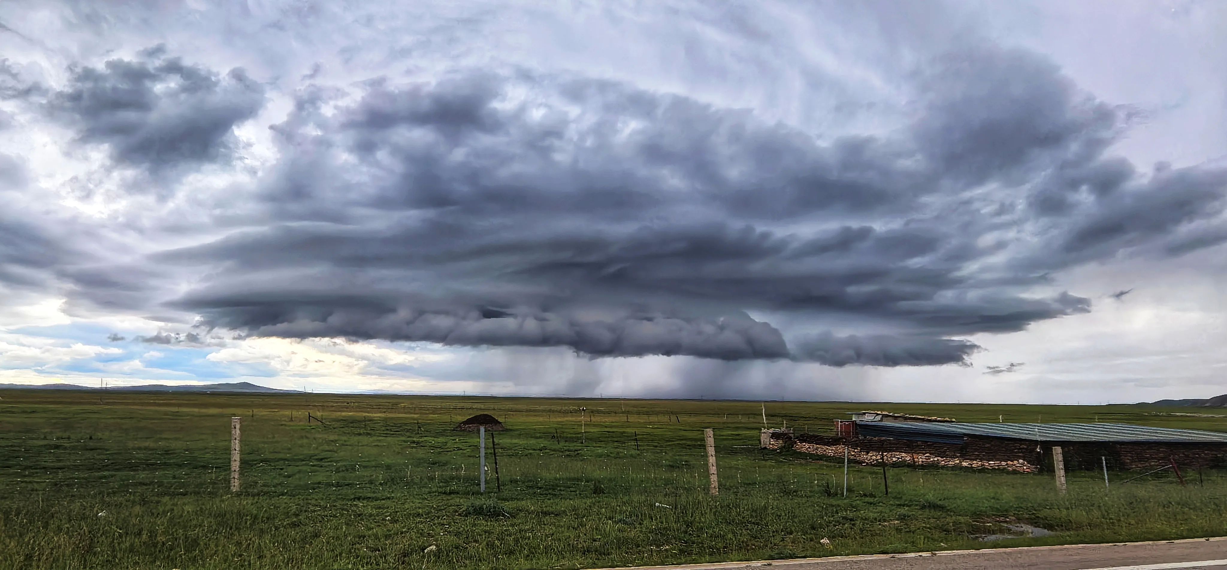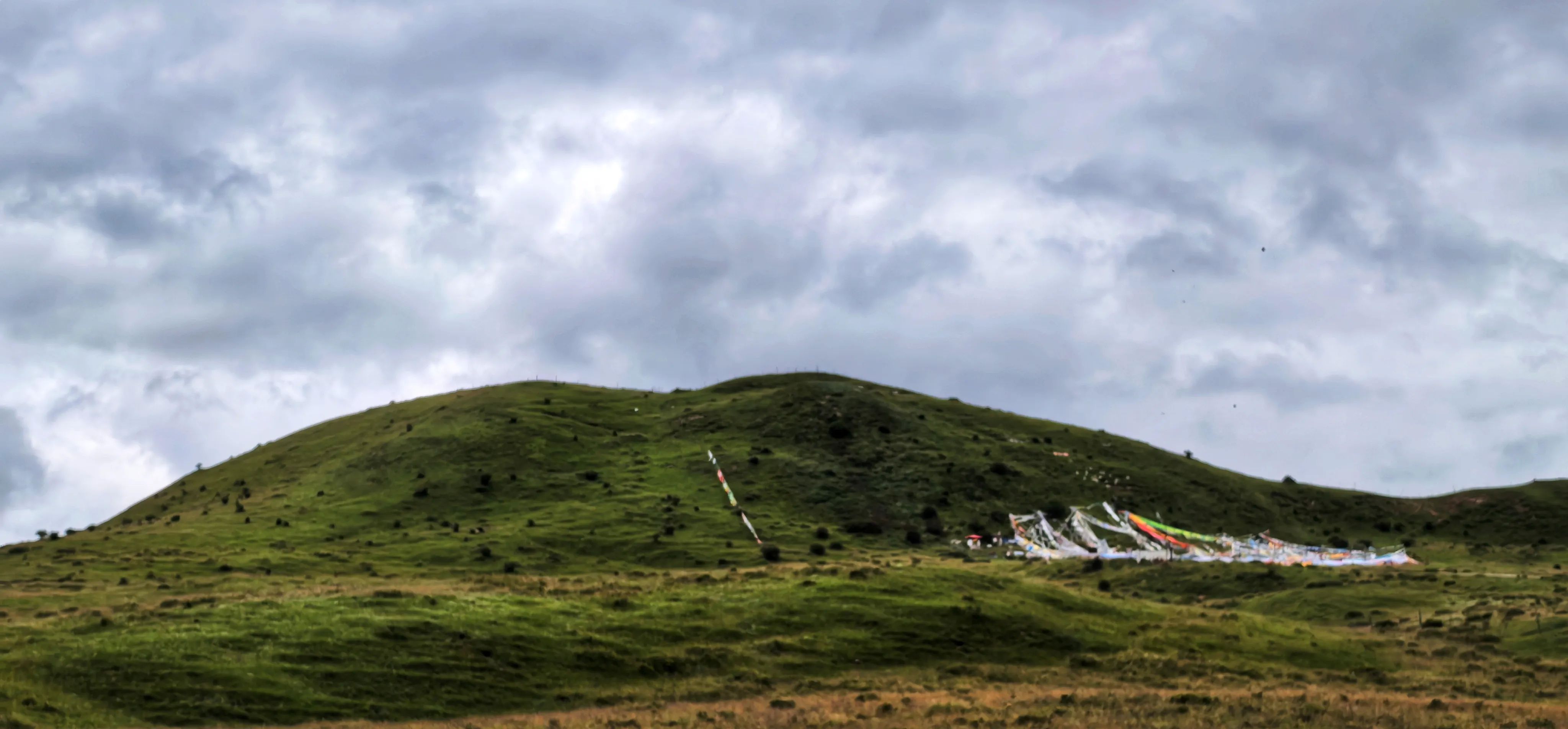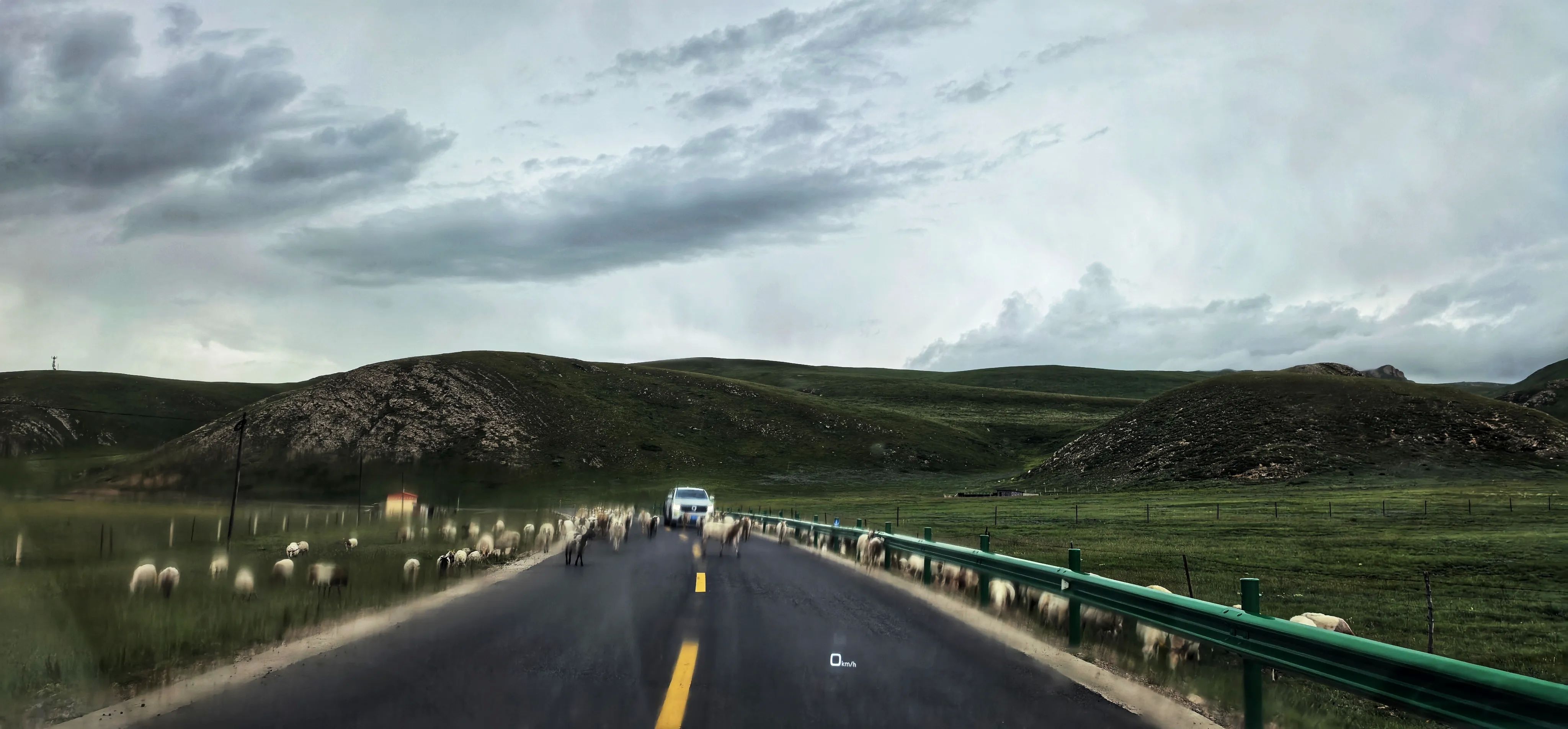 从郎木寺走国道G345到玛曲不到70公里,G534沿途风景很漂亮,这里应该还是若尔盖草原,途中看到正在下雨的巨大云团(图12),还有因下雨而着急回家的牦牛群和羊群(图13)。