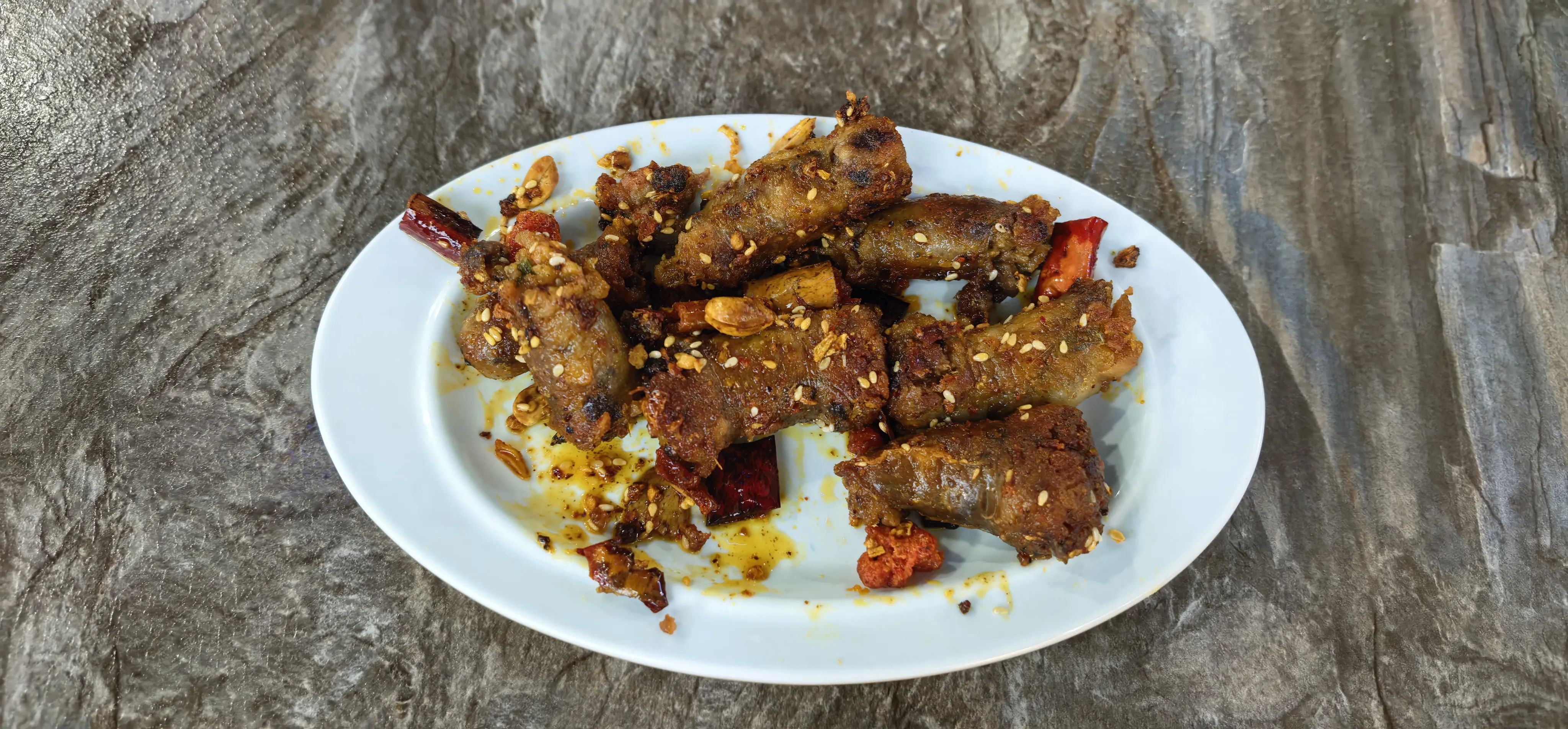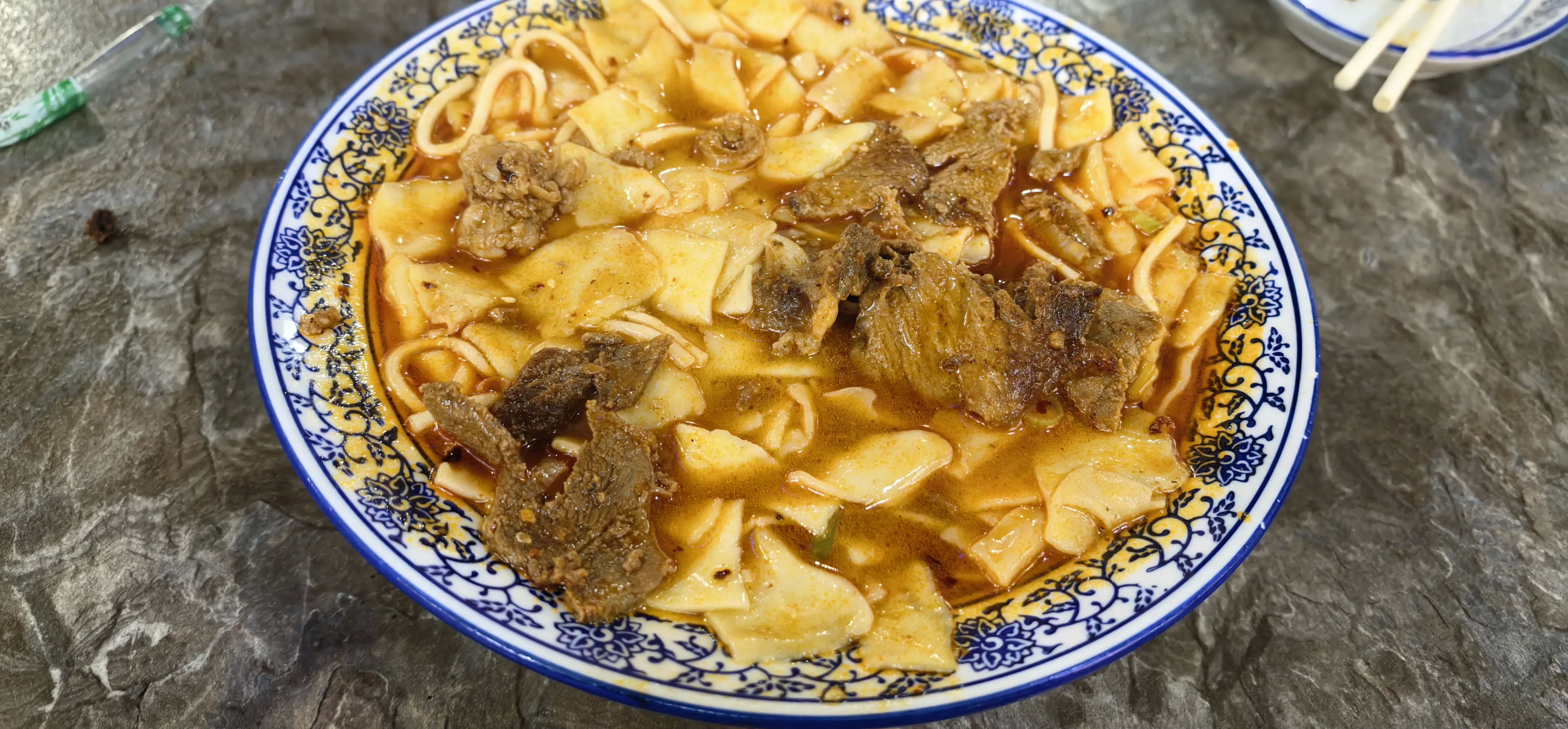 傍晚雨下大了,气温骤降,感觉有点冷。晚上住玛曲县,吃的沙迪耶舌尖面片,揪面片不错(图17),烤羊肠也好吃(图18)。