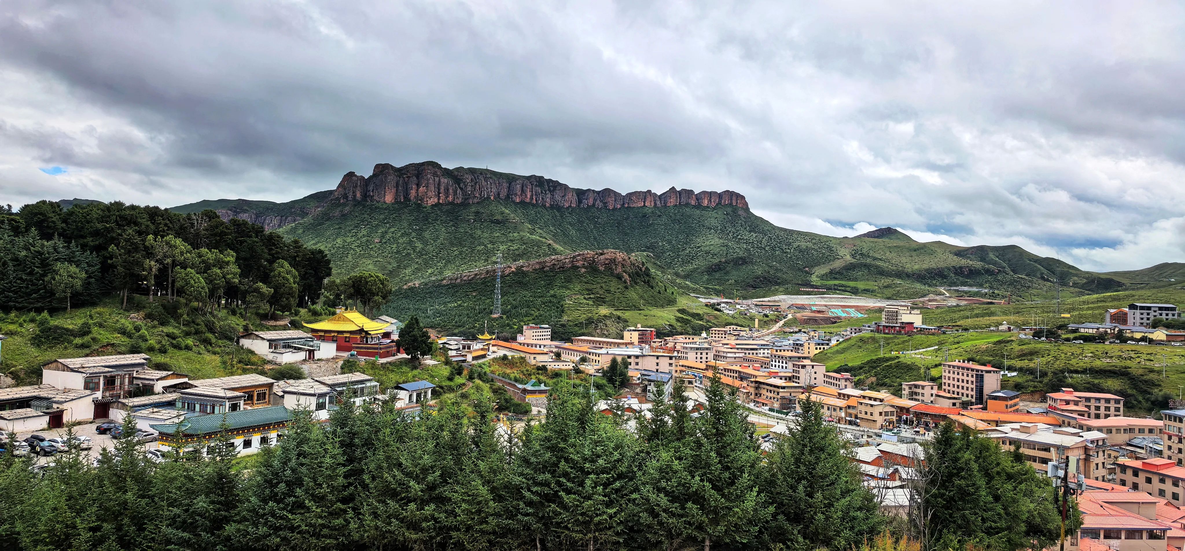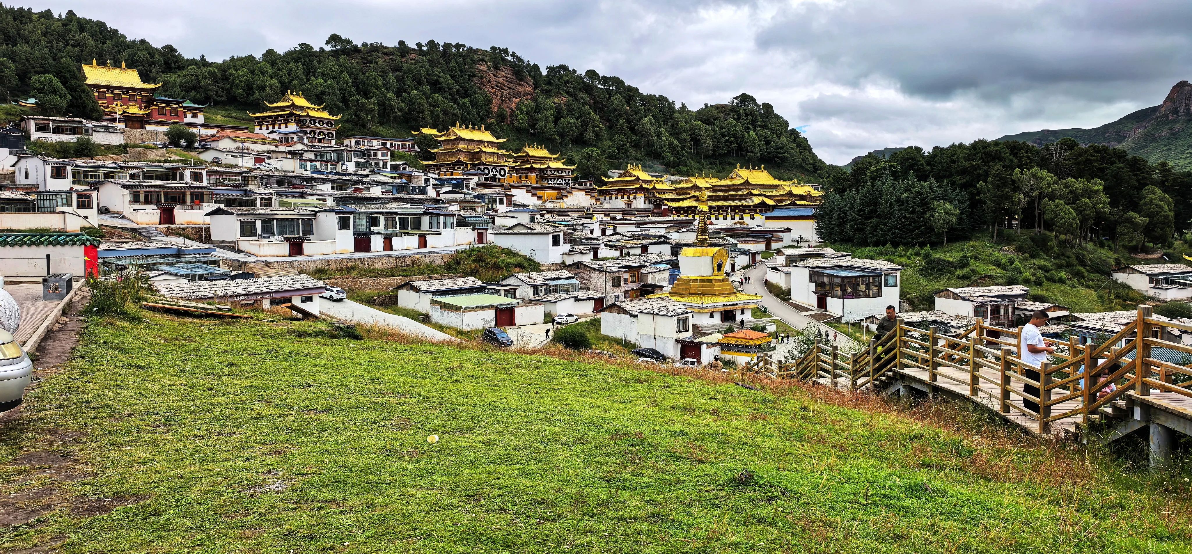 甘肃赛赤寺建在山坡上,以红墙金顶的辉煌建筑著称。购买门票和停车费后可以开车进入,上面有个观景台,可以拍摄寺庙建筑和整个郎木寺镇全貌(图4-6)。在观景台后方有个天葬台,已有400多年的历史,现已暂停参观,可以远远看到(图7)。