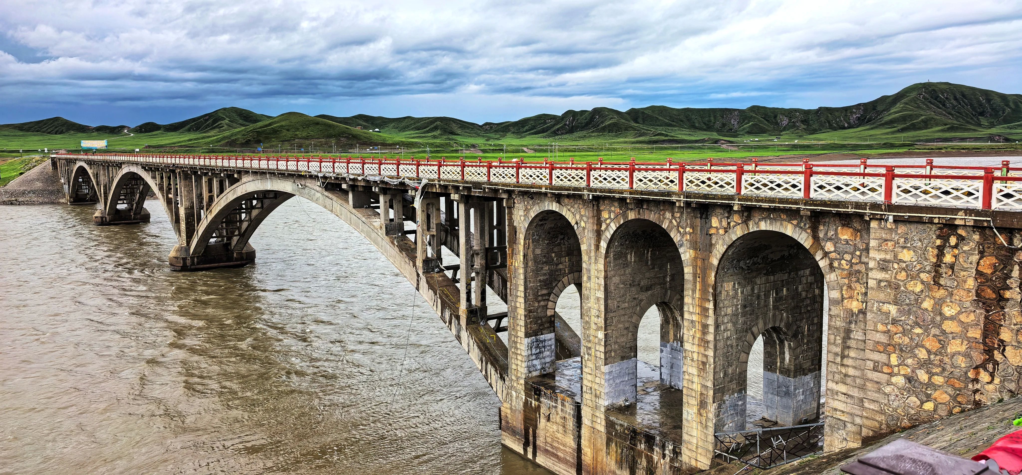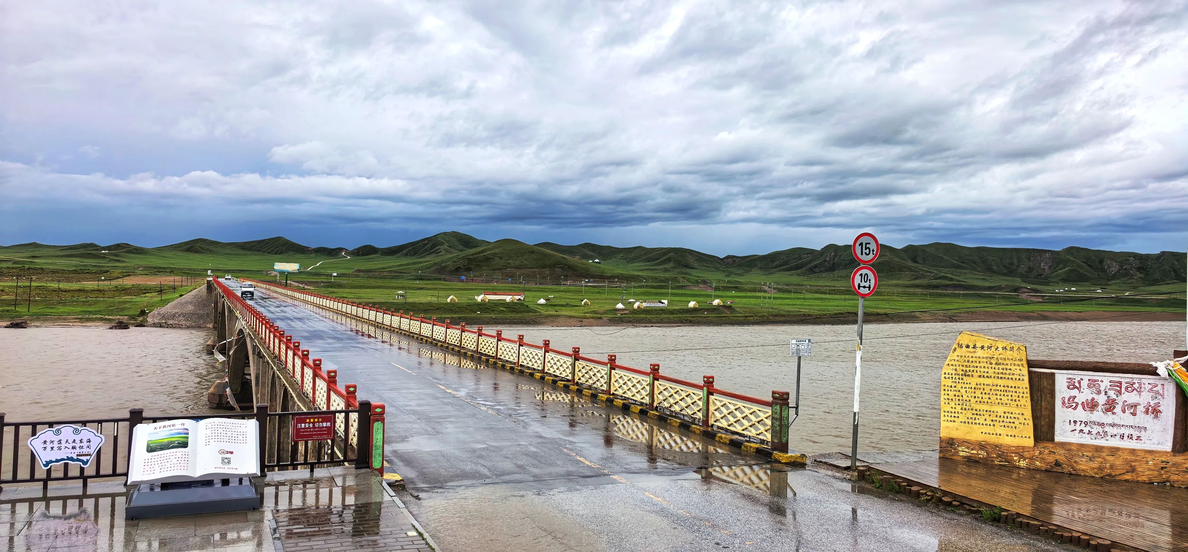 玛曲黄河第一弯景区免费,主要是打卡黄河第一弯石碑标志(图14)和黄河大桥(图15-16)。该黄河大桥于1979年8月15日竣工通车,桥全长280米,宽7.5米,是黄河上游建成的第一座黄河大桥,因此有“天下黄河第一桥”之称。
