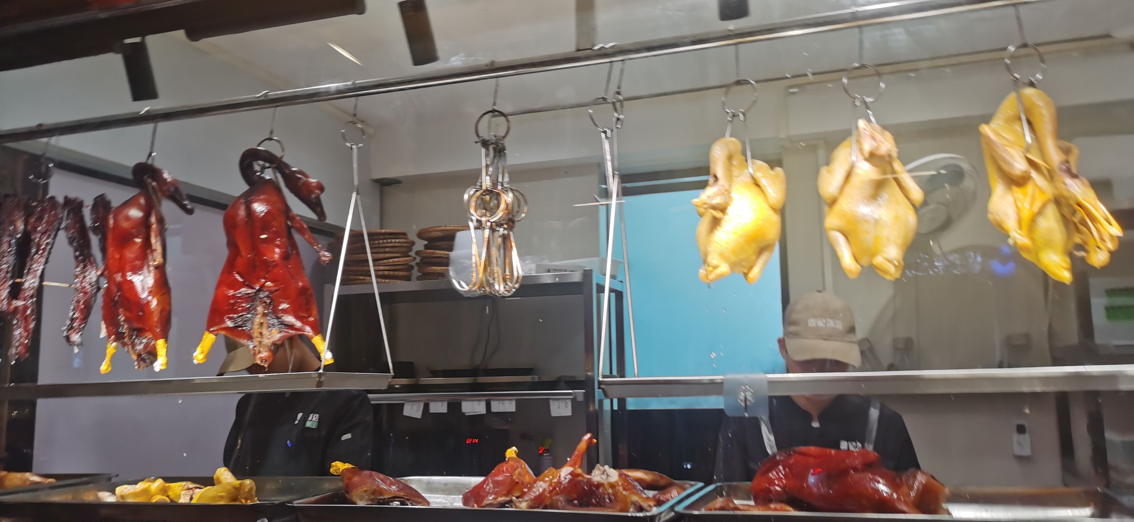 晚上我在酒店周边寻觅美食,发现了雷记饭店,招牌写着是适合家人朋友聚餐的地方。灌汤烧鹅是每桌必点的菜品,不到晚上6点30分,饭店就已座无虚席、人声嘈杂。我们三人点了五个菜,还买了一瓶山西汾酒,饱餐了一顿。