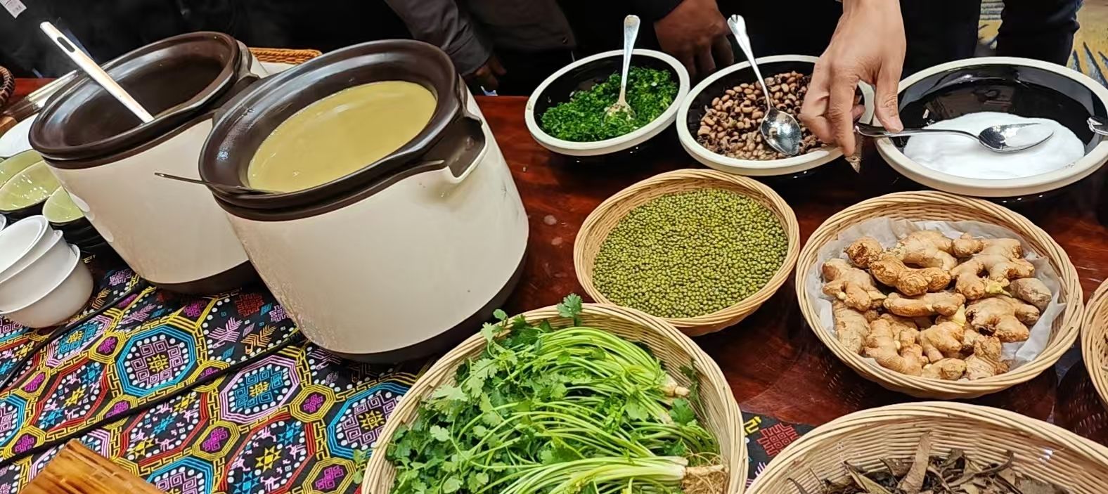 到一个地方,只在大酒店用餐可感受不到当地美食。于是早餐我去品尝了当地油茶,午餐去了不见天生料王,这是一家现炒菜肴的路边餐馆。店里有大肠、猪腰、鱼片、猪利、田鸡、黄鳝等几十种生料任人挑选,按斤售卖,一斤79元,现场炒制,还会搭配一份蔬菜。我点了通心菜,米饭和粥免费赠送,吃得十分惬意,人均消费50元。