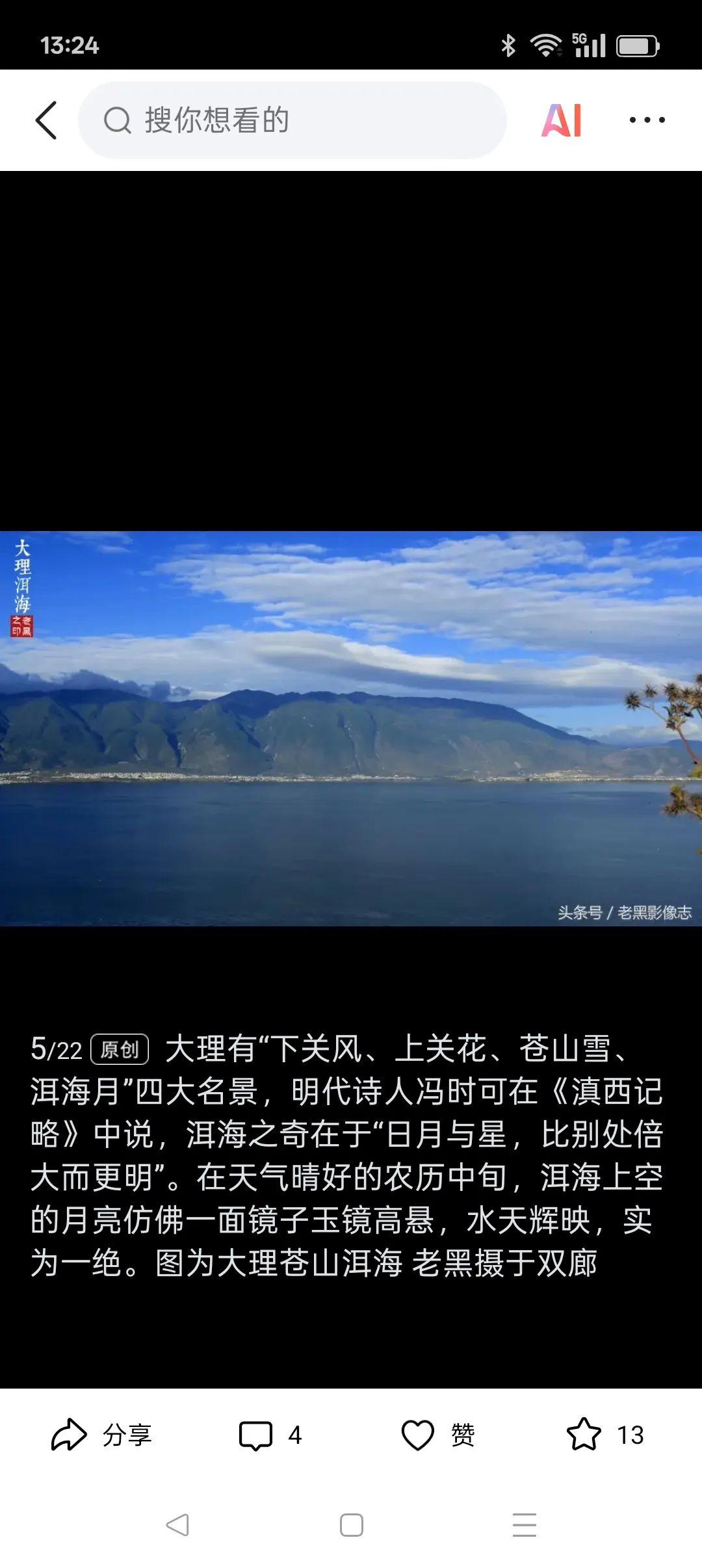 1. 洱海:云南第二大湖,风花雪月四大名景之一,湖水清澈,周边景色优美,适合环海骑行、自驾或乘船游览,如双廊、小普陀、磻溪网红S弯等景点都在洱海周边。