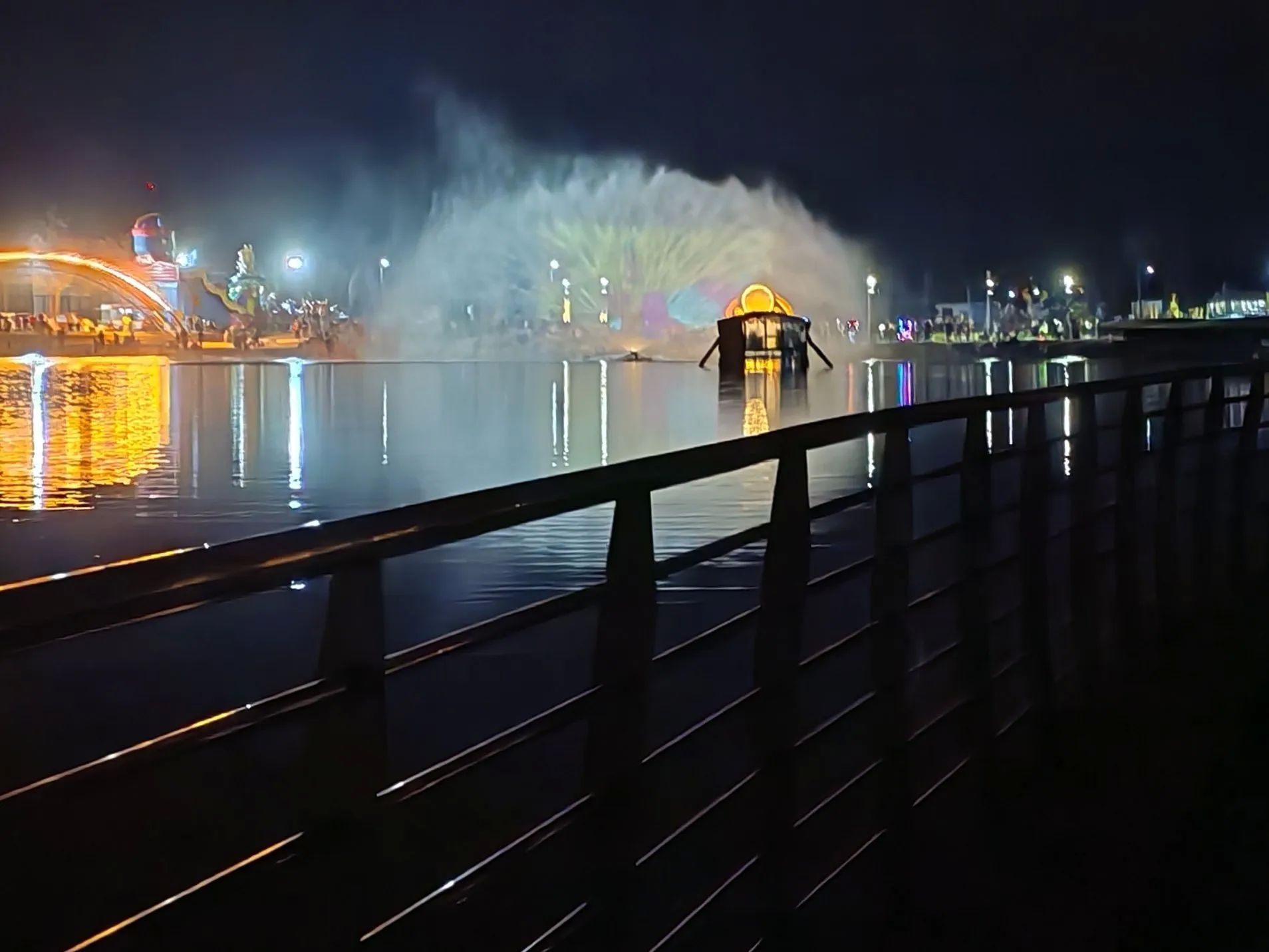 散步聊天的时候才知晓,晚上7点半湖中会放映水幕电影,这是公园专门为拉动人气推出的项目。