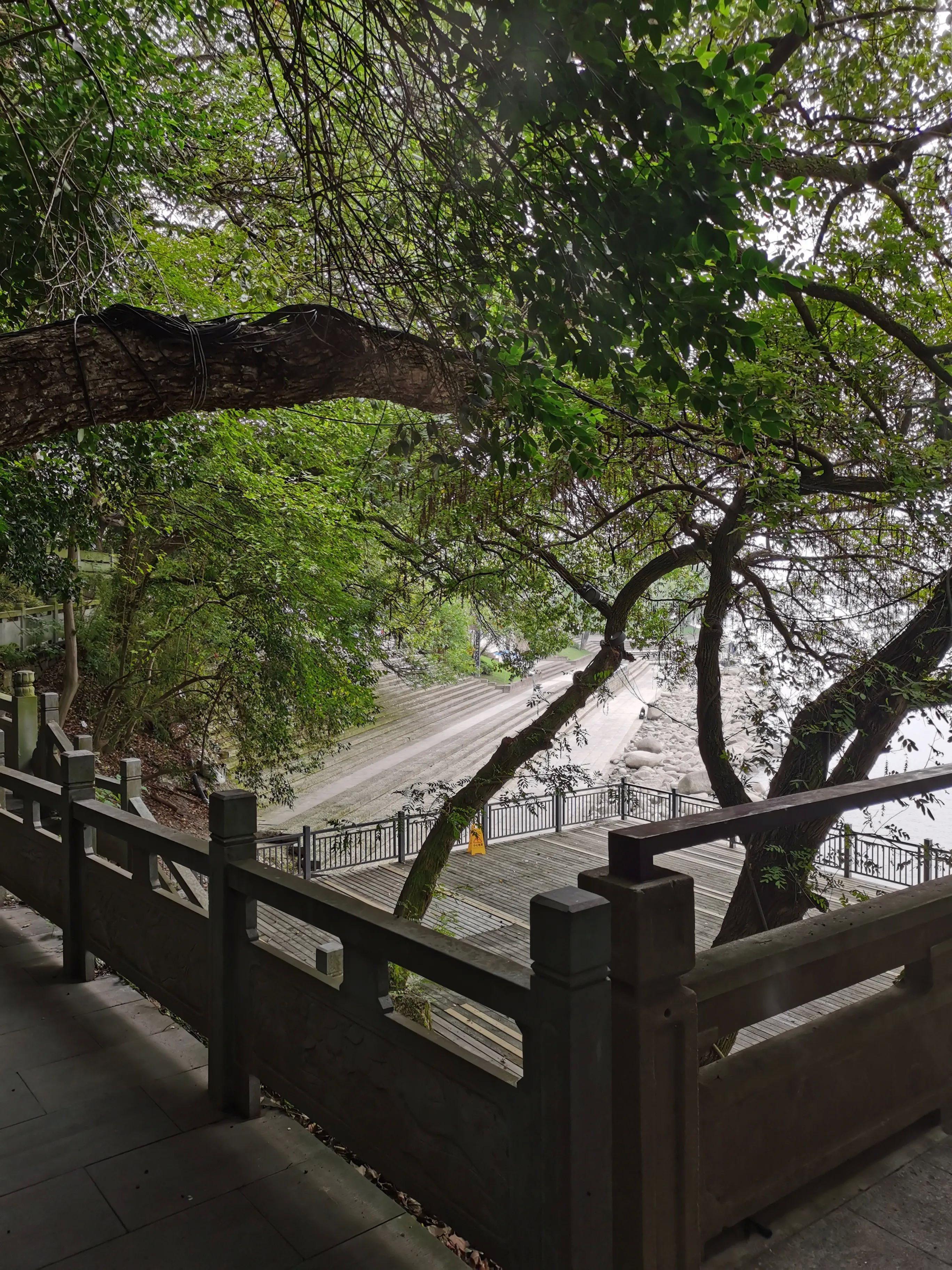 步入公园,古朴的气息扑面而来。一座巍峨的牌坊矗立门前,“鹳山”二字庄重大气,两侧石狮栩栩如生,威武如守护神,高悬的红灯笼则增添了几分亲切详和。沿着蜿蜒的鹅卵石小径或质朴的江滨长廊前行,富春江的浩渺风光便徐徐展开。波光粼粼的江面如同铺开的绸缎,偶有船只犁开清波,搅动一池碎金,对岸景致与横跨江面的大桥尽收眼底,宁静中透着生机。