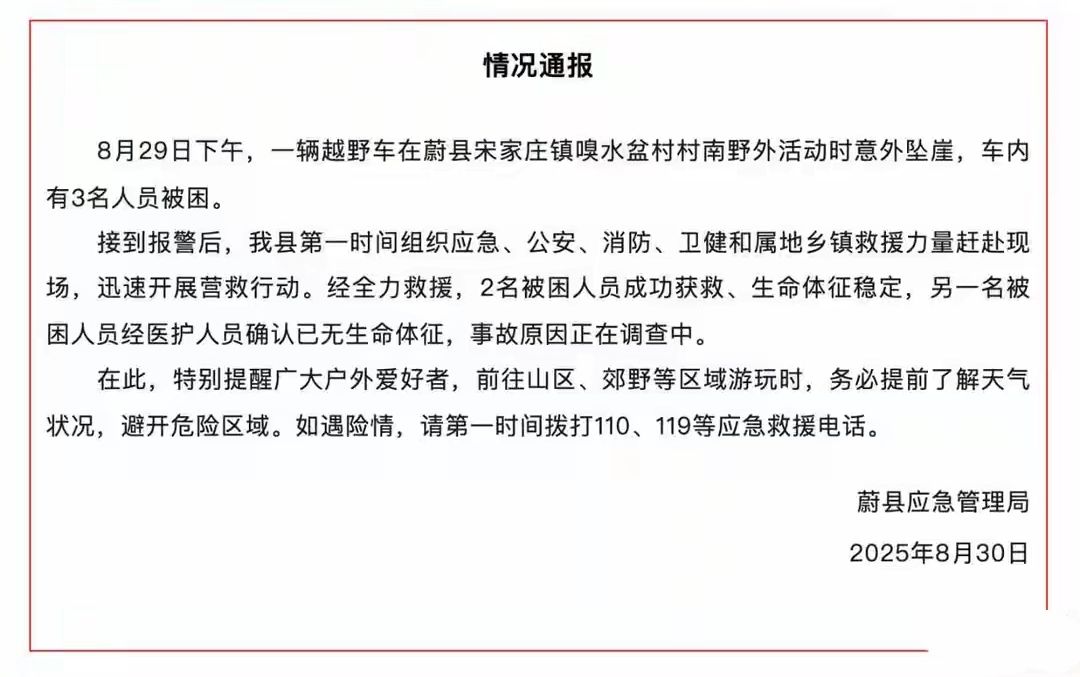 谁能想到,一次郊野自驾竟酿成悲剧?8月30日河北张家口蔚县应急管理局发了通报,8月29号下午,一辆越野车在当地宋家庄镇嗅水盆村村南野外活动时不小心坠崖,车里3个人都被困了,最后1个人没救回来,另外2人虽然获救,但这事想想都让人揪心,目前事故原因还在查。