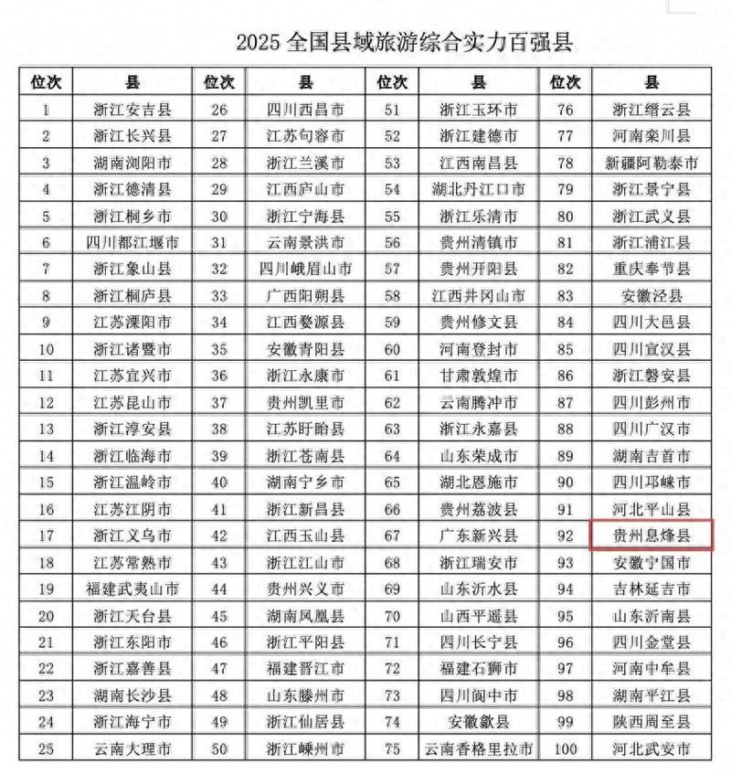 贵州息烽上榜2025年全国县域旅游综合实力百强县。