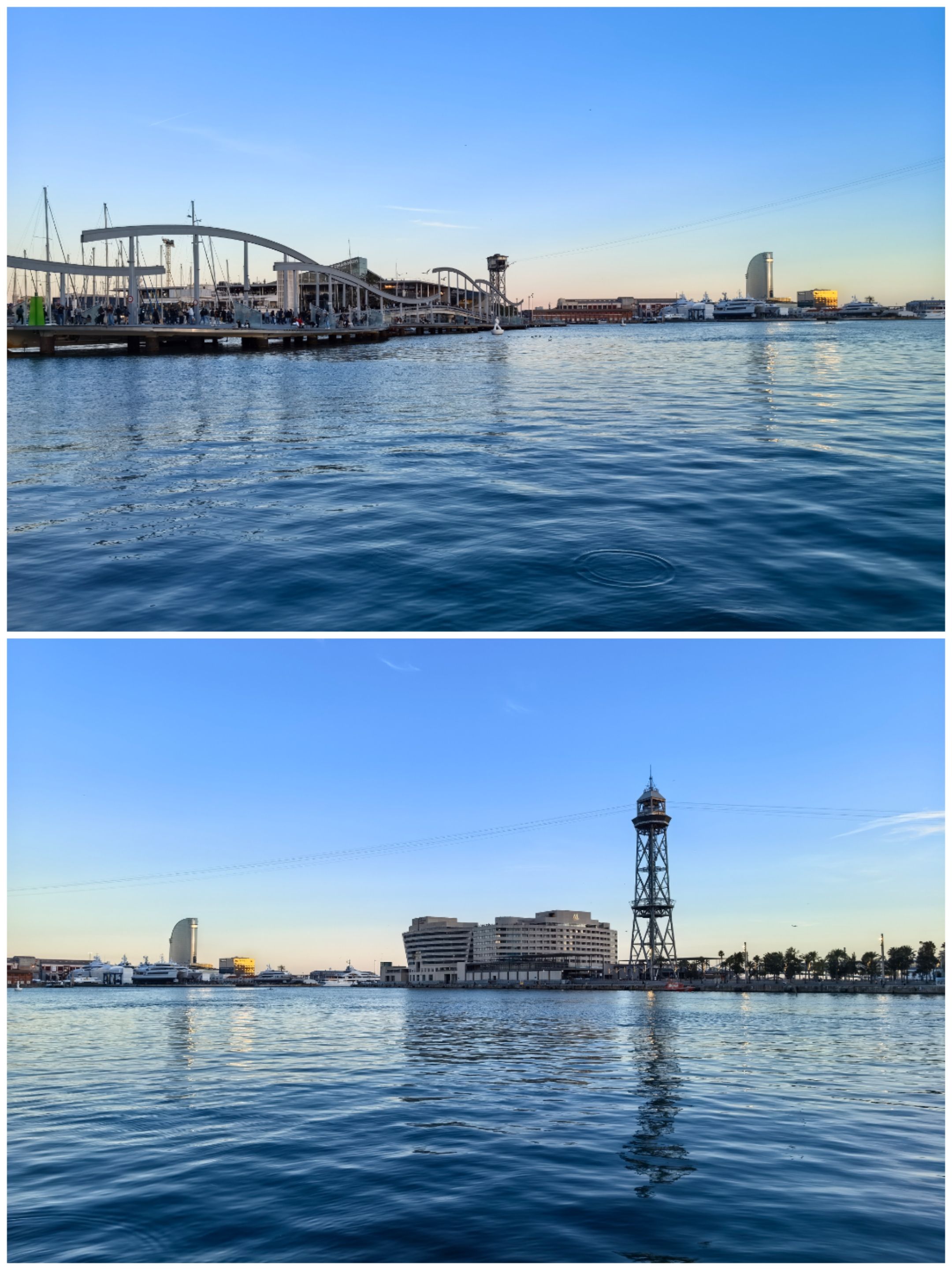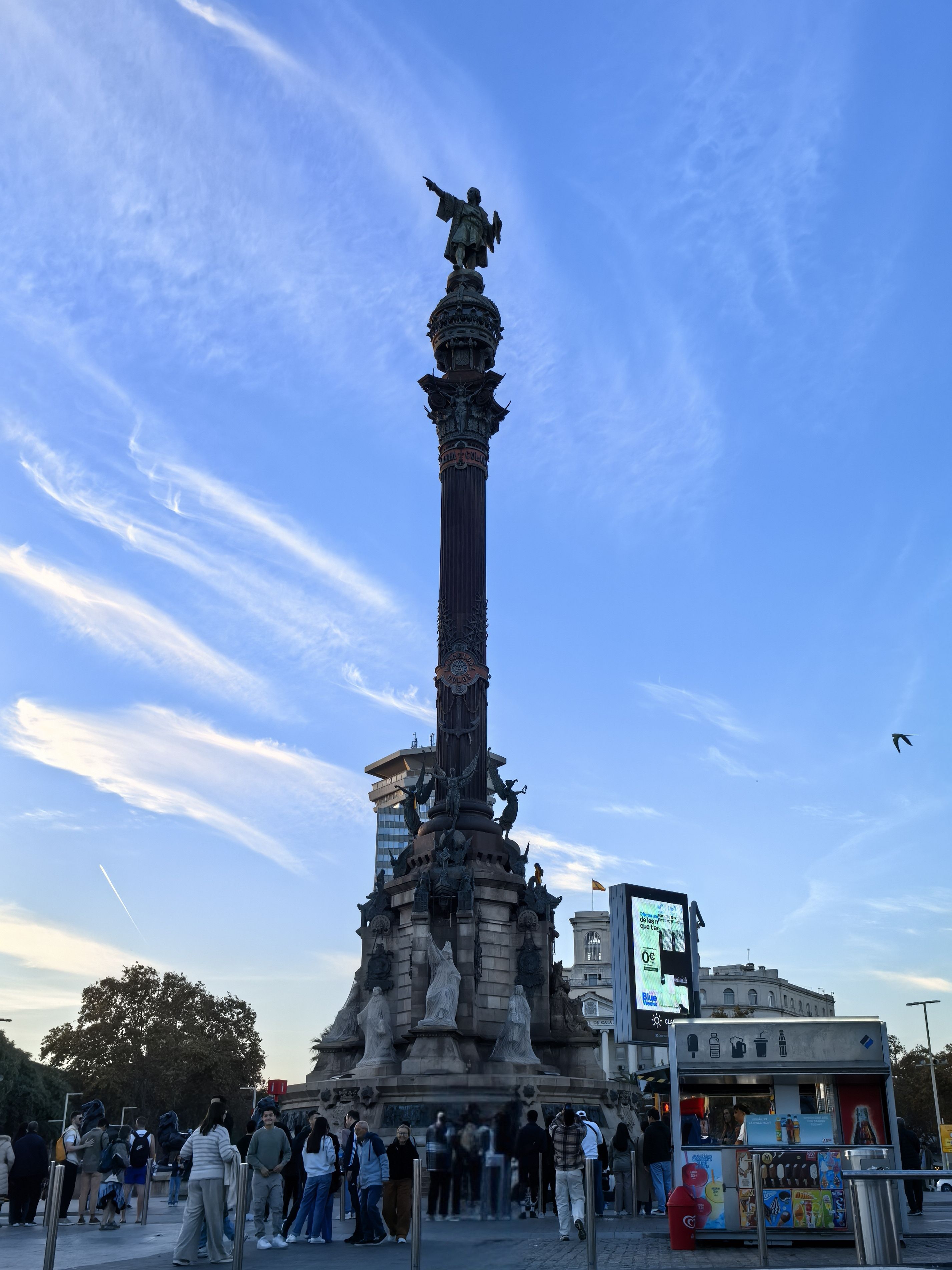 哥伦布广场,位于兰布拉大道尽头,是市中心与海港相连的标志。它高60米,由赭棕大理石建成,顶端矗立着7.2米高的哥伦布全身立像,该立像是由蒙杰伊克城堡前的大炮熔化后铸铁制成。从这里可眺望对岸的新港和游艇码头,周边有众多帆船俱乐部和商业中心。