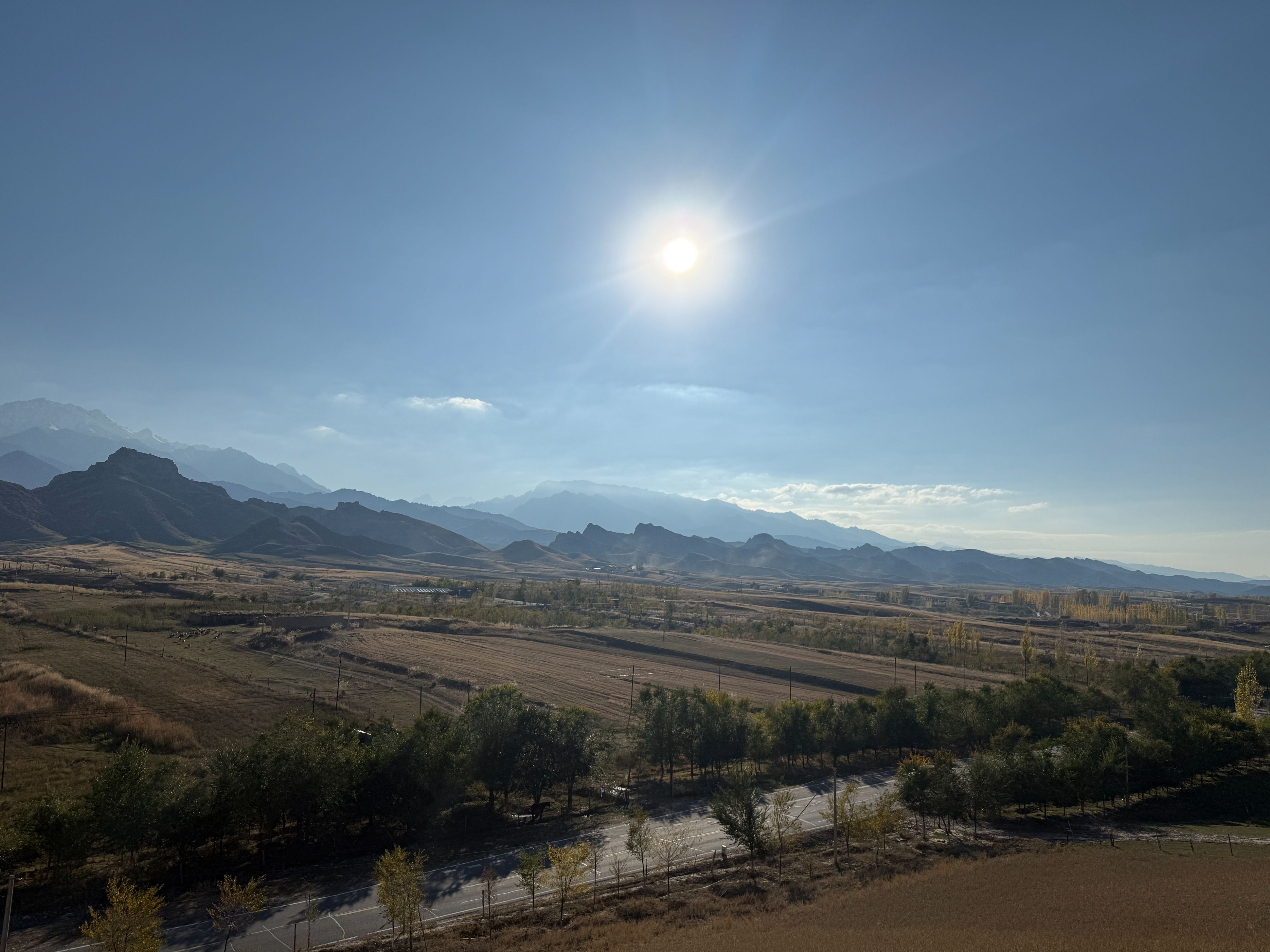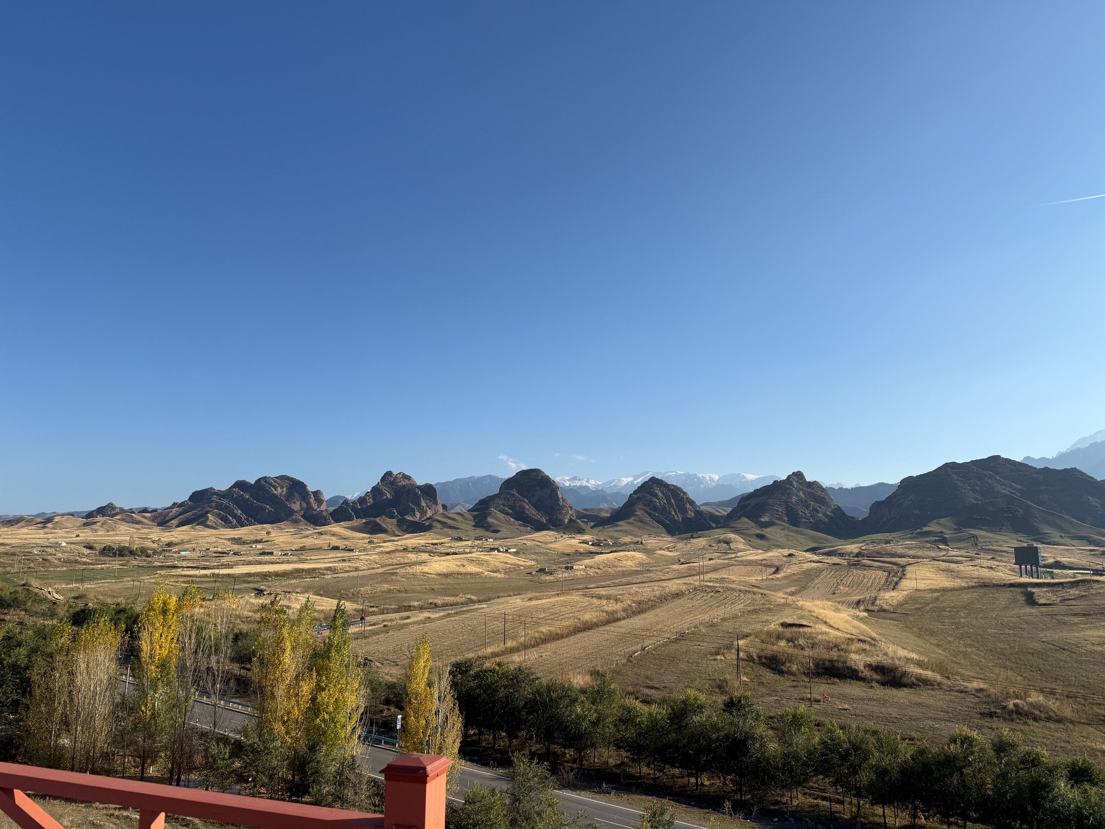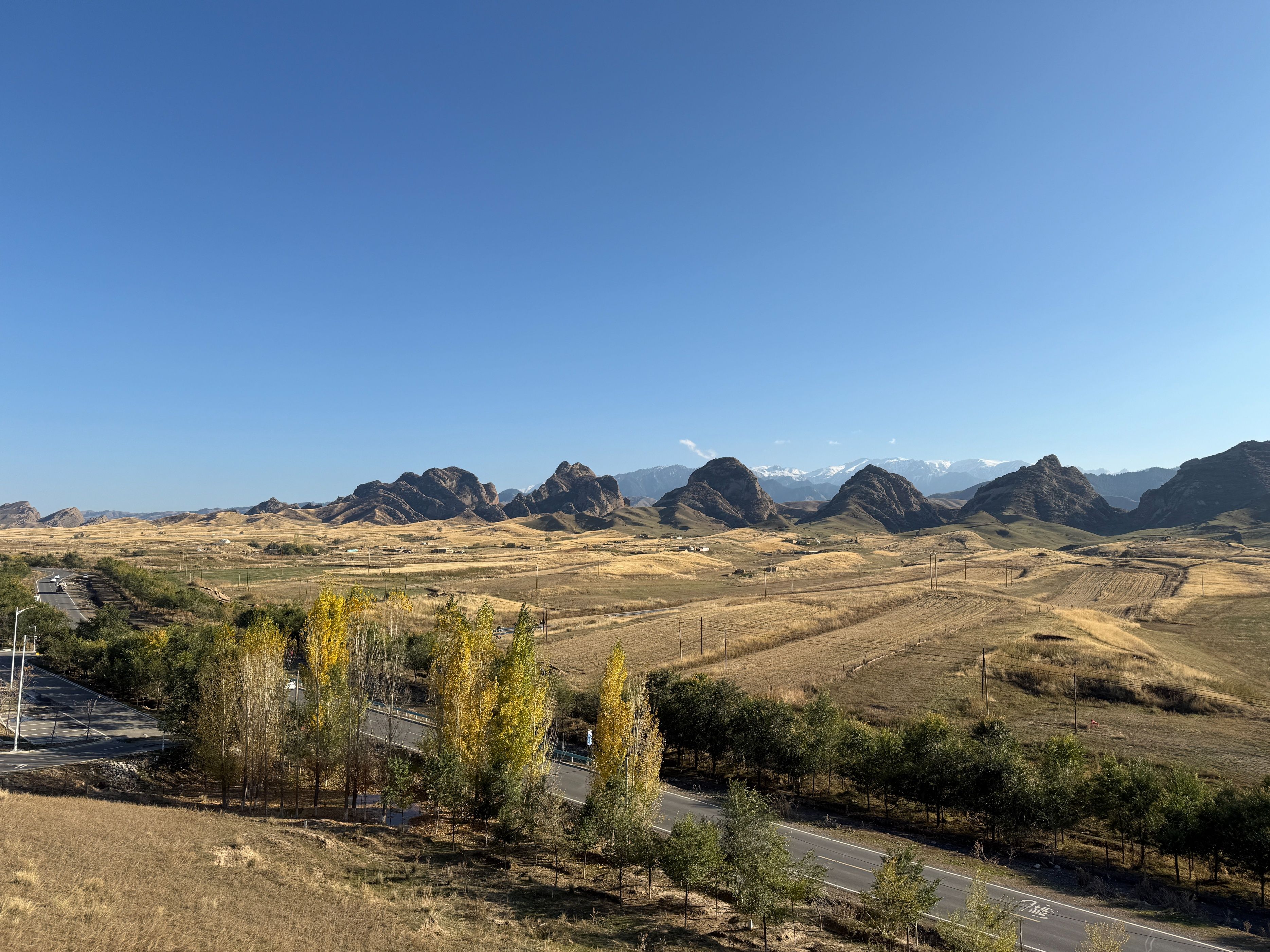 今天从玛纳斯国家森林公园出发,穿越乡道、县道,到达了S101的著名景点:五道垭驿站,在这里休憩了一会儿之后,又向着肯斯瓦特方向开车,回到了石河子,一路上真是风景如画。玛纳斯国家森林公园,高德推荐的地点是神榆台景区,这个地方今天人很多,说实话,略有些名不副实,进去的车流排队有一两公里,景区内的榆树确实壮观,不过此外了无所有。离开森林公园之后,我们从乡道倒到县道,这一路上有一些水果采摘点,两边地里正在收棉花,路上大车较多,而双车道很窄,开车需要小心一些。甫一进入S101,真是风景如画,有森林河流、丹霞草甸、高山森林……时而行走在河谷,时而行走在山峦,两边美景应接不暇。可能一些人觉得夏天绿树成荫具有美感,但是深秋的时候,两边植物的叶子,颜色深浅错落,草原一眼望去,苍莽广袤,更能给人以视觉的冲击。站在五道垭驿站的观景台,让人不由生出天大人小的感慨。从五道垭向肯斯瓦特的方向,车流慢慢变多,路边的白杨树叶子落了厚厚一片,我们在那里停留了许久,蓝天、白树和黄叶相映成趣,过了林带,有上世纪八九十年代的粮站、小卖部,不过都废弃了,让人不禁生出关于过往的遐思。肯斯瓦特人很多,执勤的警察忙着指挥,因为不好停车,我们没做停留。过了这里,有几个可以露营的驿站,采用帐篷出租的形式,我夏天来的时候,有一些人在那里过夜看星星,天气冷了,问津的人不多。今天虽然只走了一小部分S101的道路,但是还是被它的苍莽美感征服,推荐大家有空,尽可以去自驾,享受山间明月江山清风。