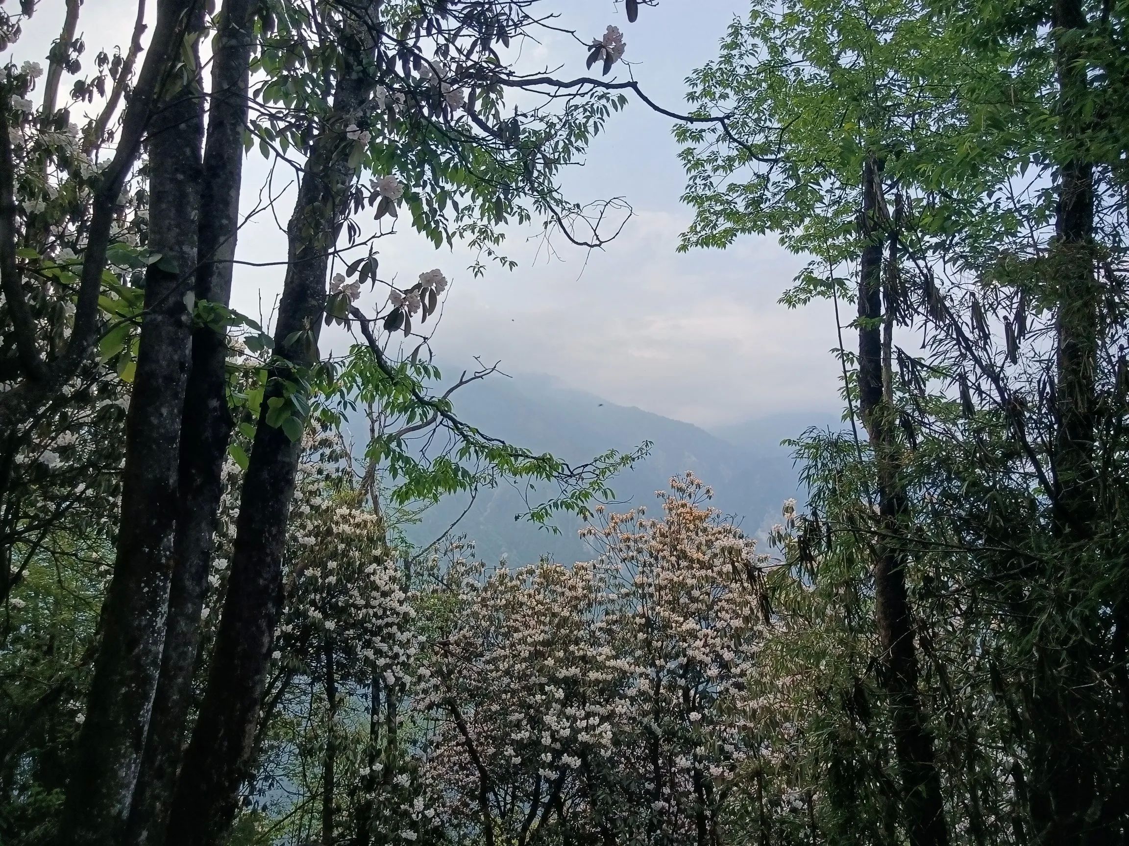 观光车的终点玻璃栈道才是真正徒步的起点,至天虞峰(海拔2020),再绕行至后山山门,至少需要六个小时!杜鹃花在海拔一千五米以上,有一公里的距离,完全在花海中穿行,珙桐也恰逢花季,白色的鸽子花在风中摇曳,极美!