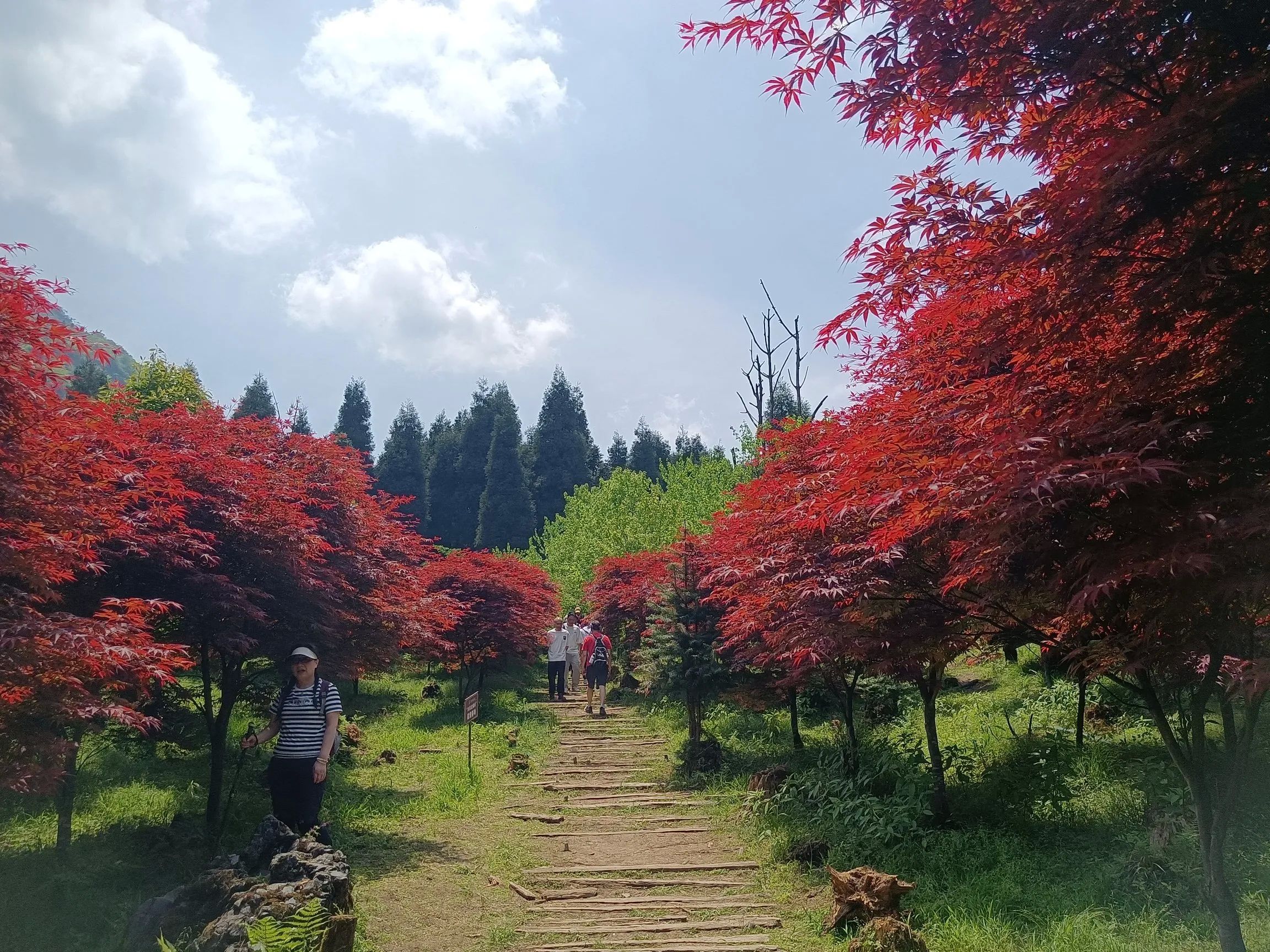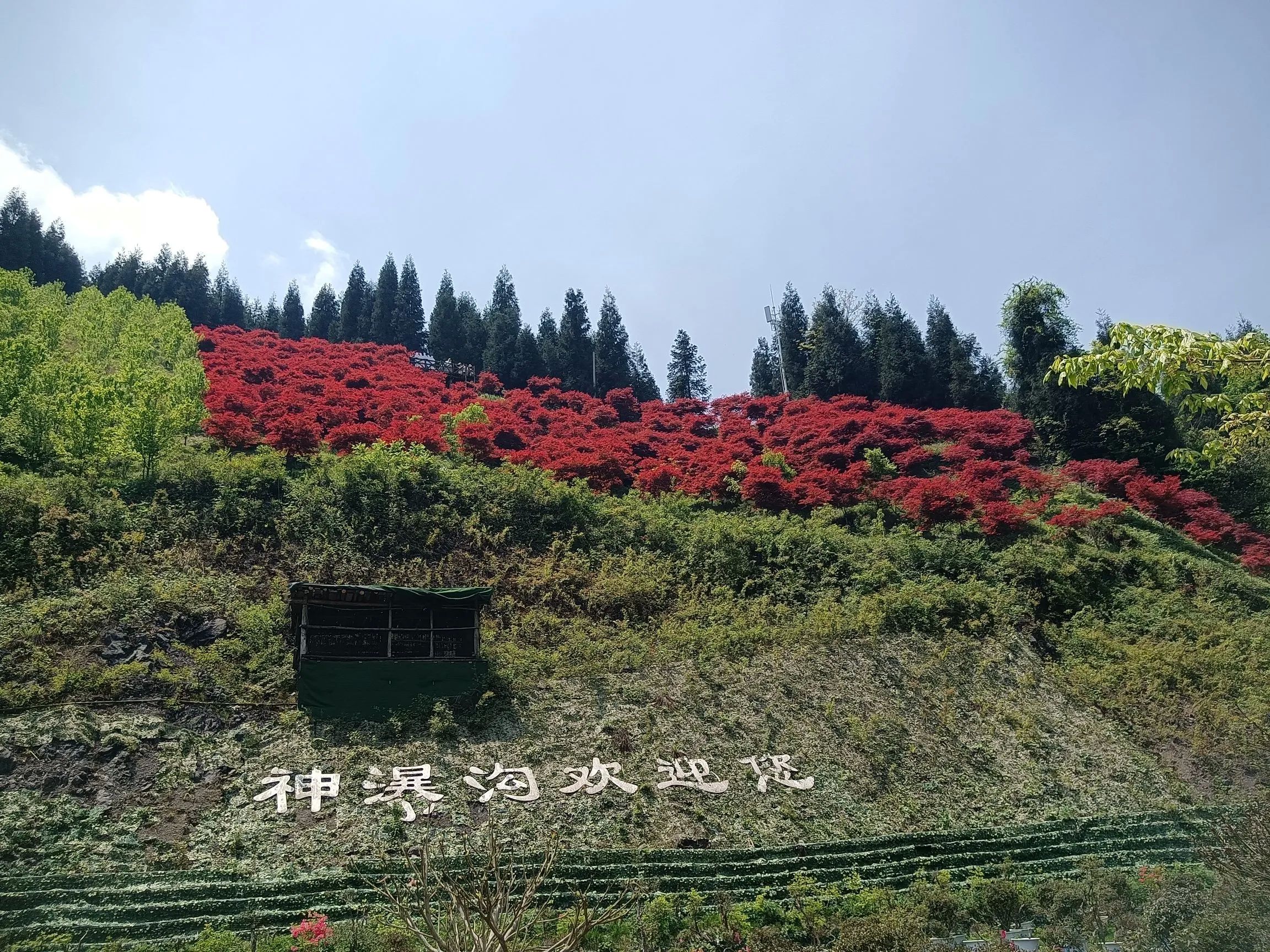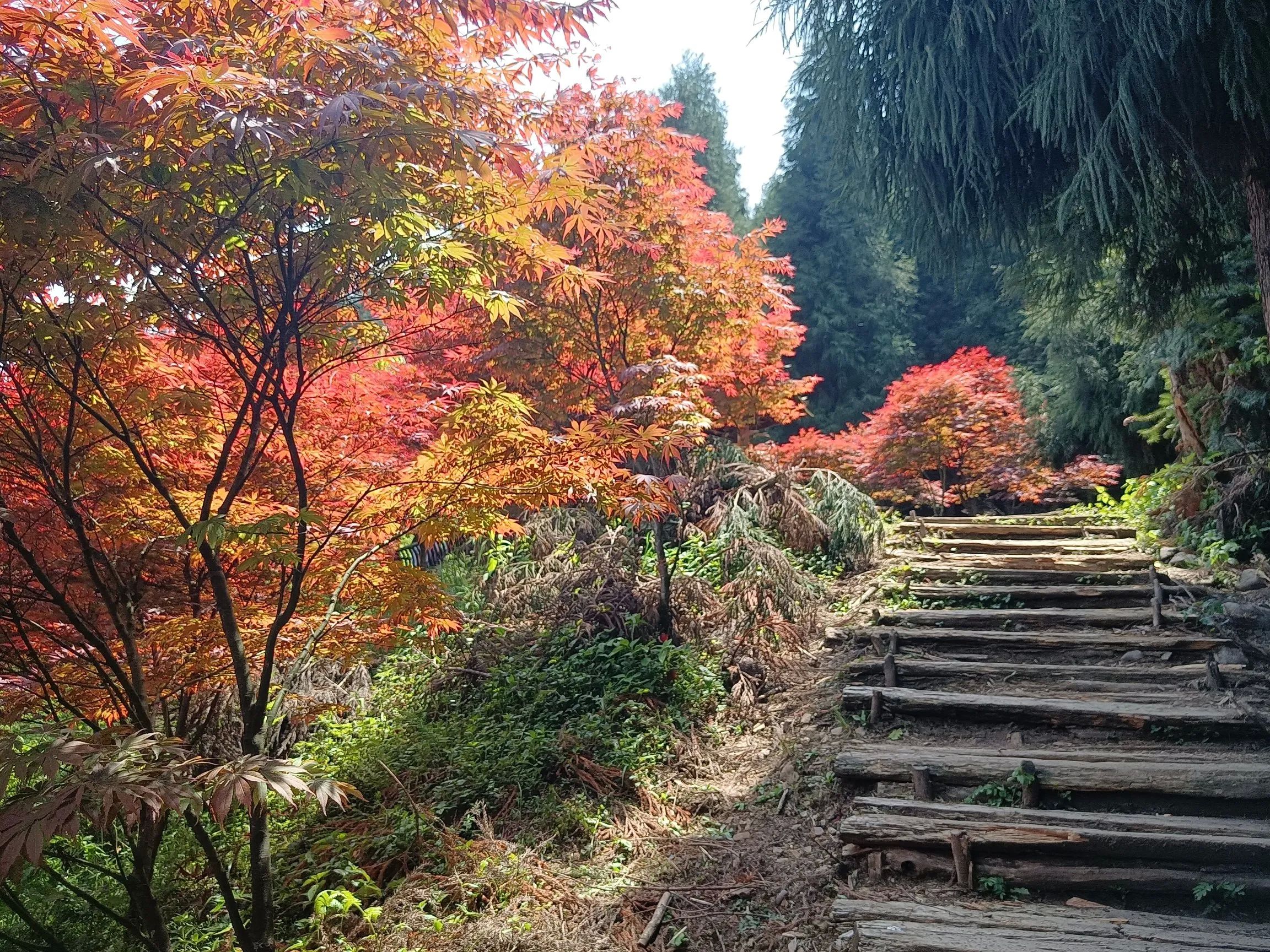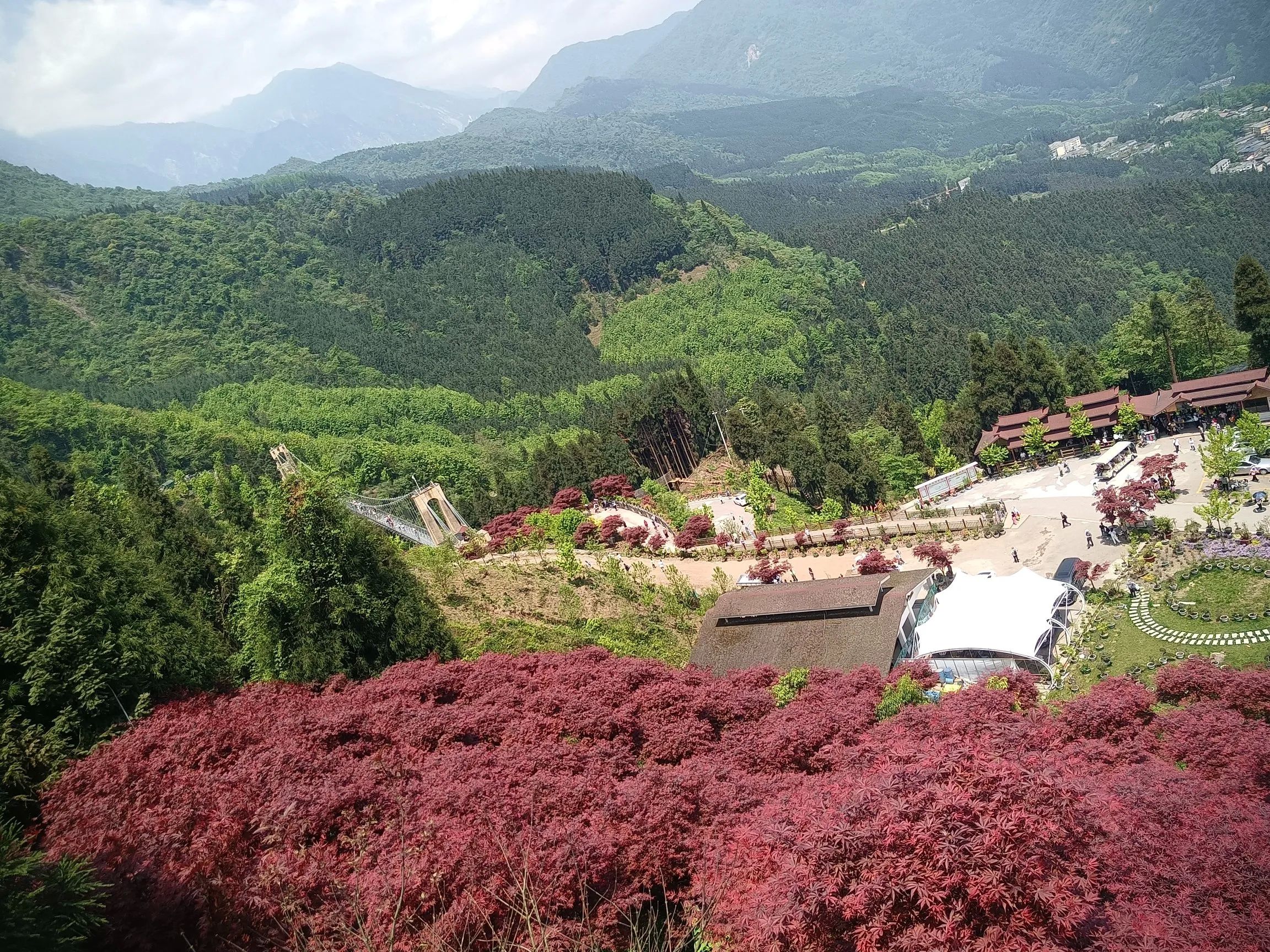 正确的路线应该是从前山门徒步至玻璃栈道,一个多小时,沿途可观瀑布,在玻璃栈道看看红枫林,有一些游乐设施,可选择坐观光车或者徒步下至后山门,观光车也就十分钟,沿途是看不到杜鹃花的!