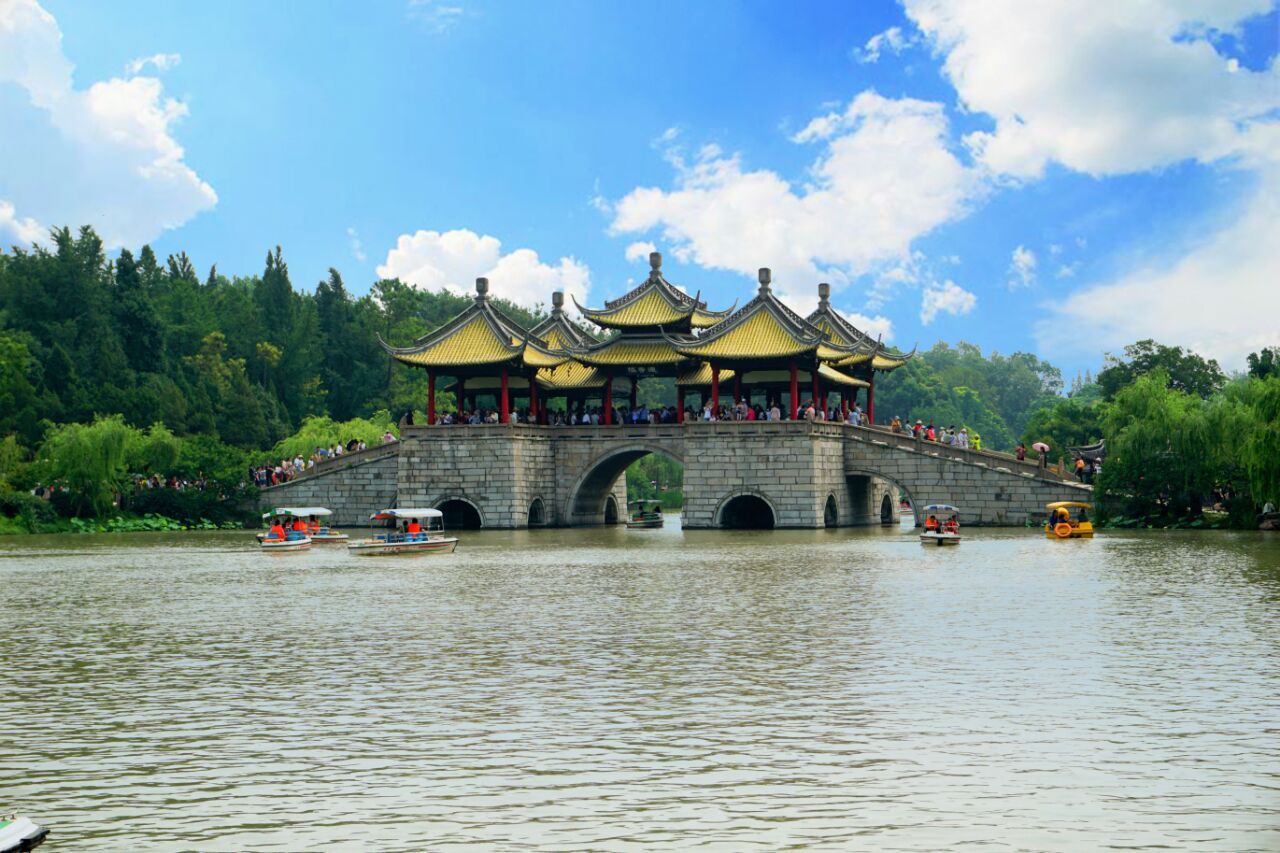6. 扬州瘦西湖:“两堤花柳全依水,一路楼台直到山”,坐画舫穿过五亭桥,看24孔桥洞与倒影合成满月,是乾隆帝私藏的湖上园林。