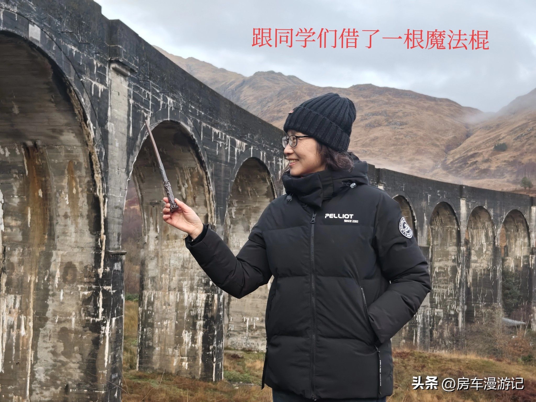 在这又碰到两拨中国留学生,一拨马上毕业下周回国,一拨还得在读几年。我跟一位穿着哈利波特黑披风的男同学借了一根魔法棍,指着那一排桥墩,施个魔法留个影。哟,瞧瞧,这谁家妈妈呀?[捂脸]