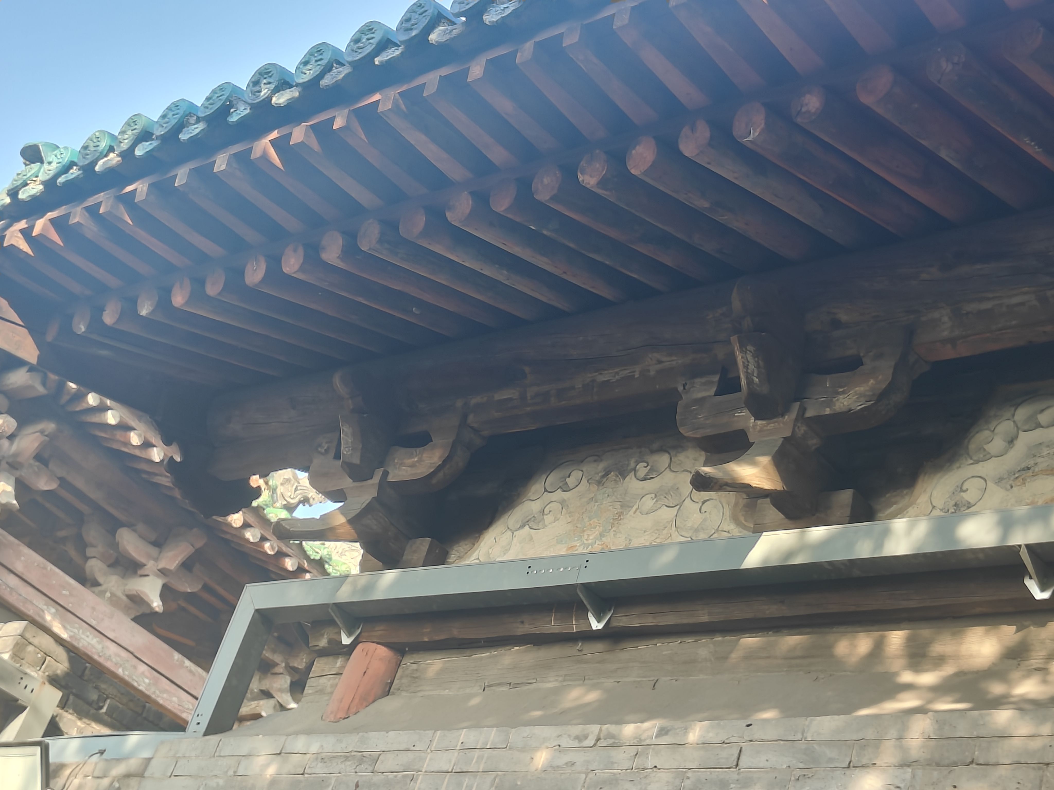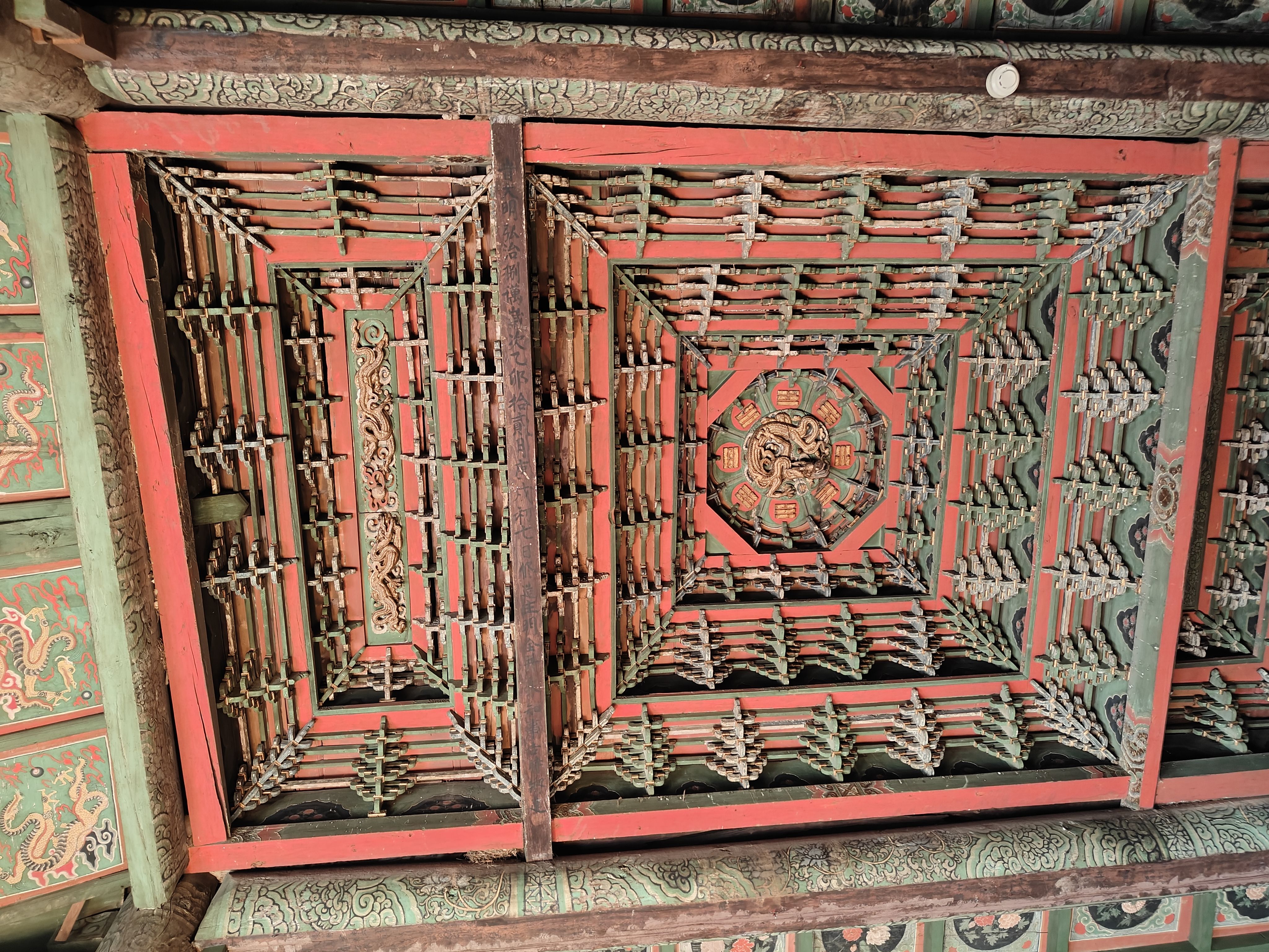 藻井:药师殿的八卦藻井设计精巧,斗拱叠涩,绘有彩色团花图案,象征中草药,是国内罕见的建筑奇观。