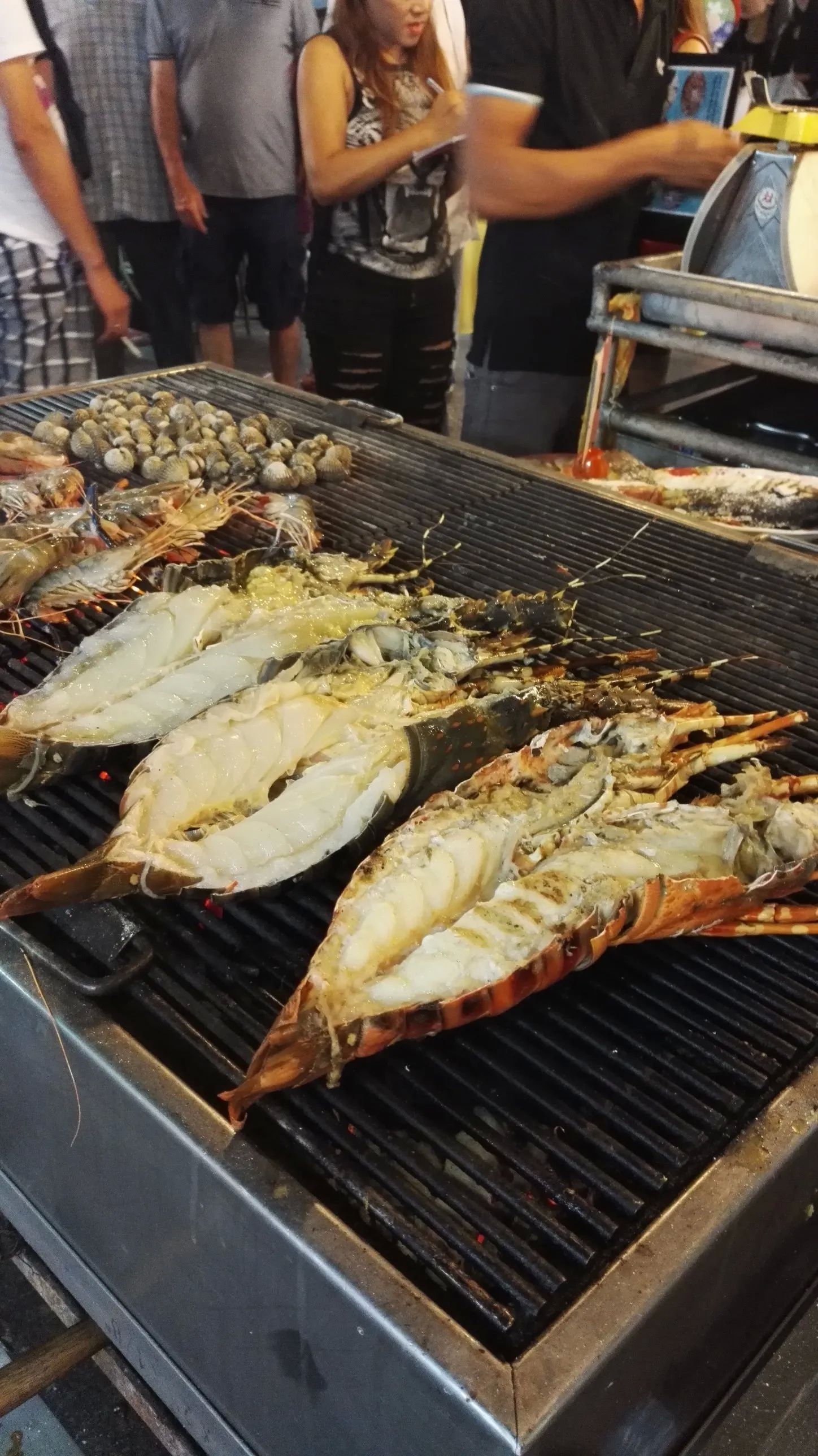 因为不想去那些热门地方比如芭提雅,想躲着旅游者去探索当地人生活的地方,于是就去了华欣。在那个夜市,我被海鲜价格惊呆了。一条特别大的特别新鲜的烤龙虾只有200块钱人民币!足足够四五个人吃个饱了!可惜的是我一个人实在吃不了这么大的龙虾,只好放弃!这就是一个人旅游不方便的地方。最后我要了一份烤的奶酪大对虾。逛完花欣夜市三天后,从新闻上得知那个夜市发生了恐怖袭击,好几个人失去了生命。这也是挺悬的…