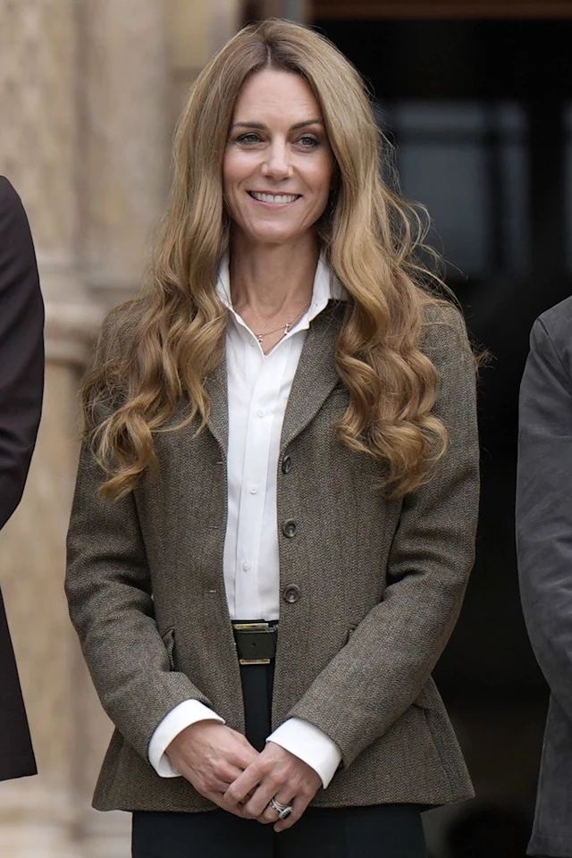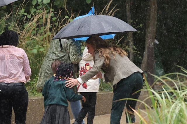 现场照片显示,凯特身穿一件剪裁得体的西装外套,内搭一件简洁的白色衬衫,下穿长裤,整个人看起来干练又优雅,雨中漫步更是增添了几分浪漫氛围。