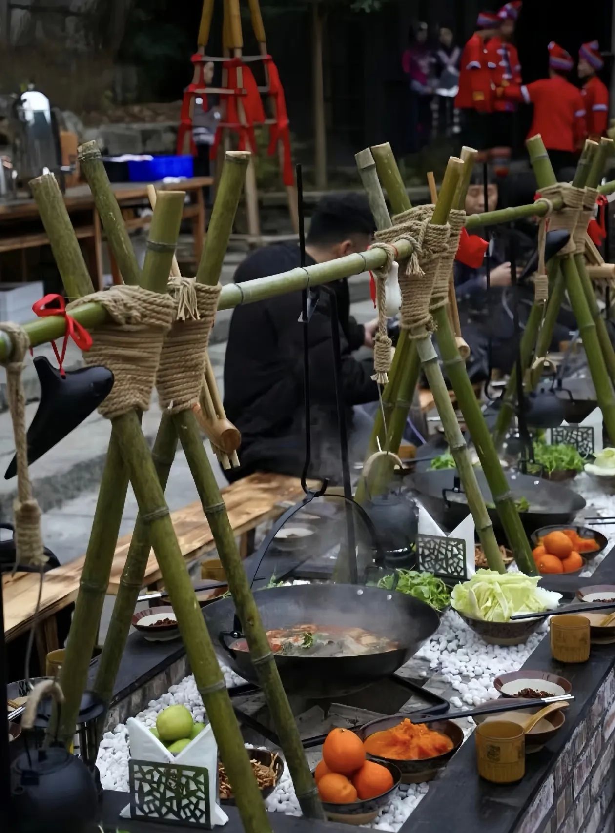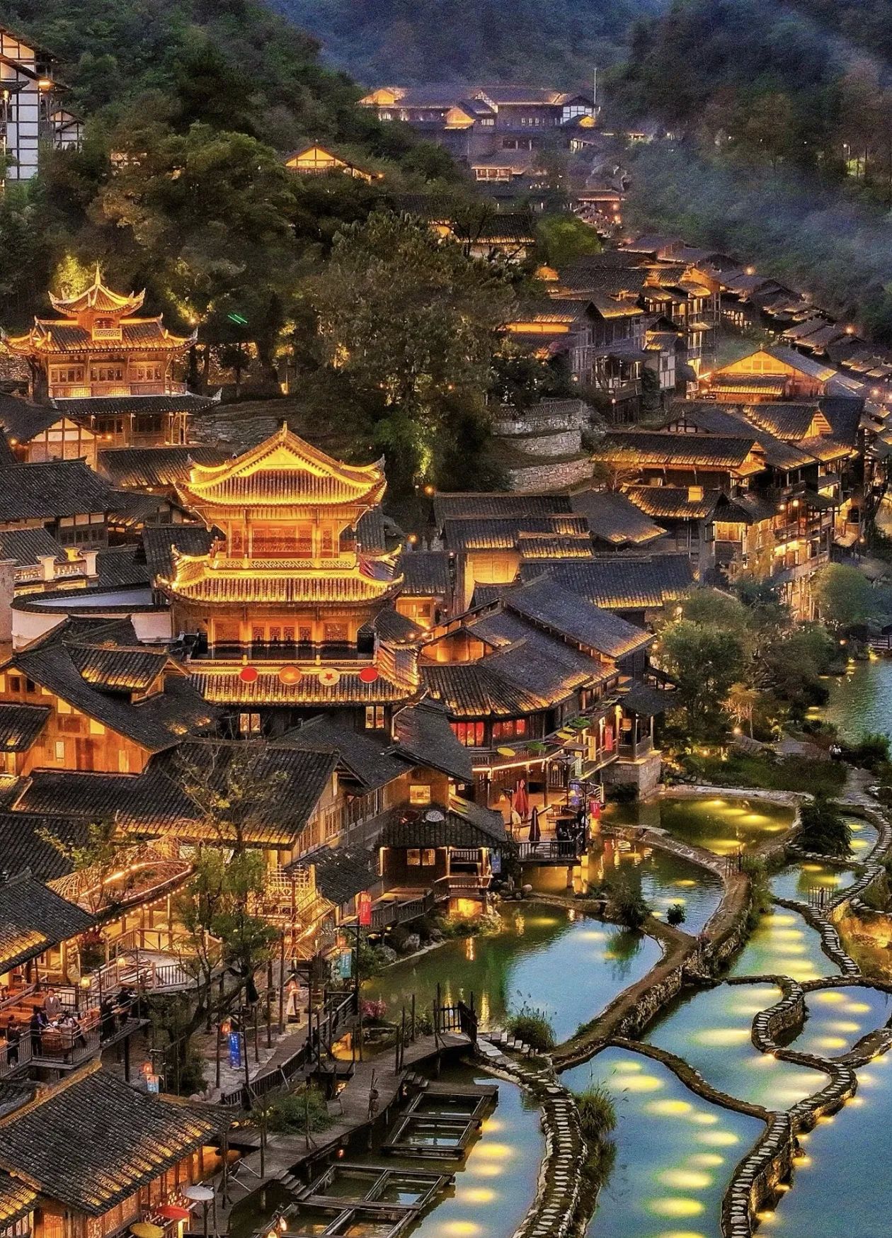 乌江寨游玩路线:乌纸坊-独竹漂-亚鲁王廊桥-晚上掌灯仪式-音乐水舞秀-篝火晚会(迴龙岛)-太乙廊桥。