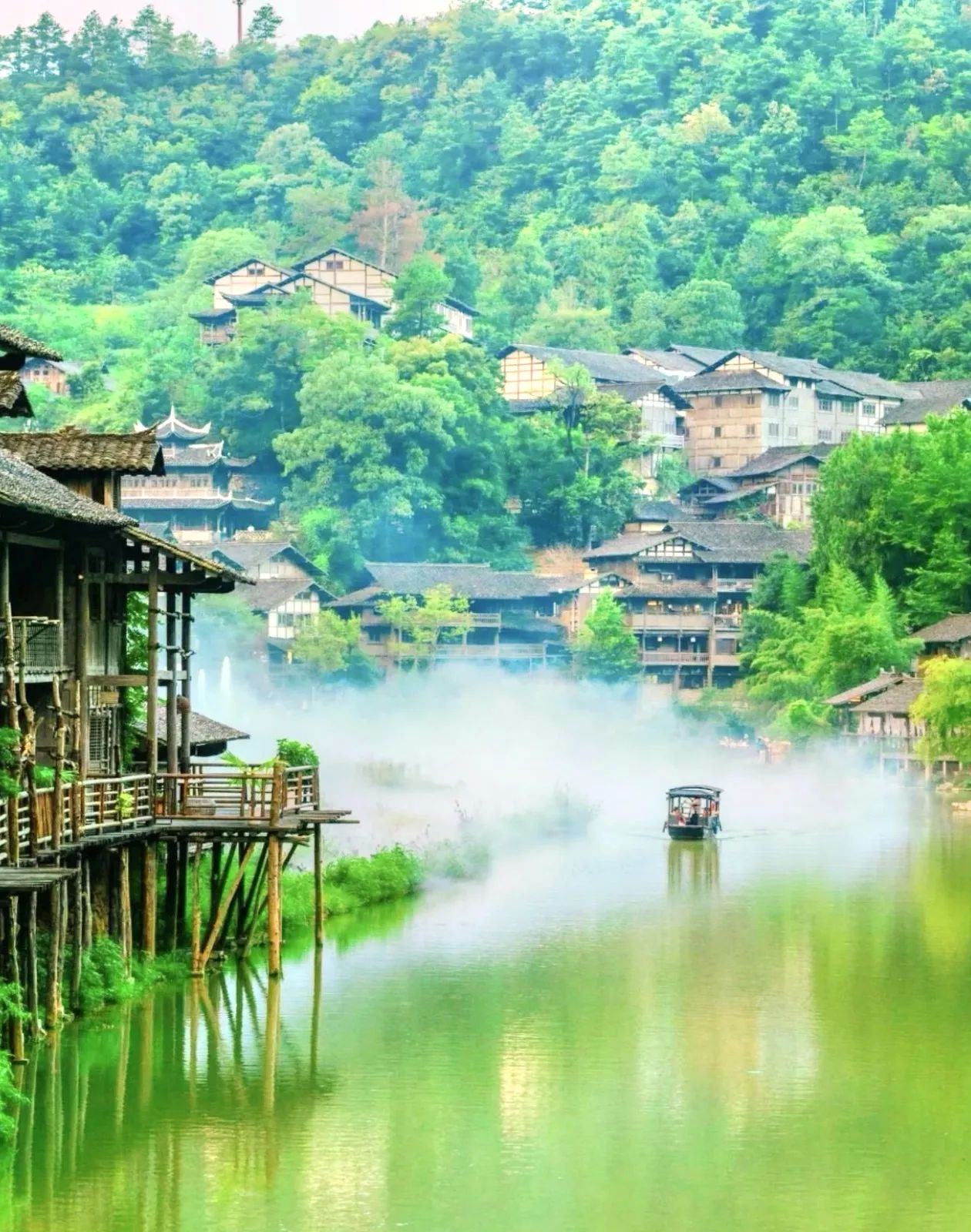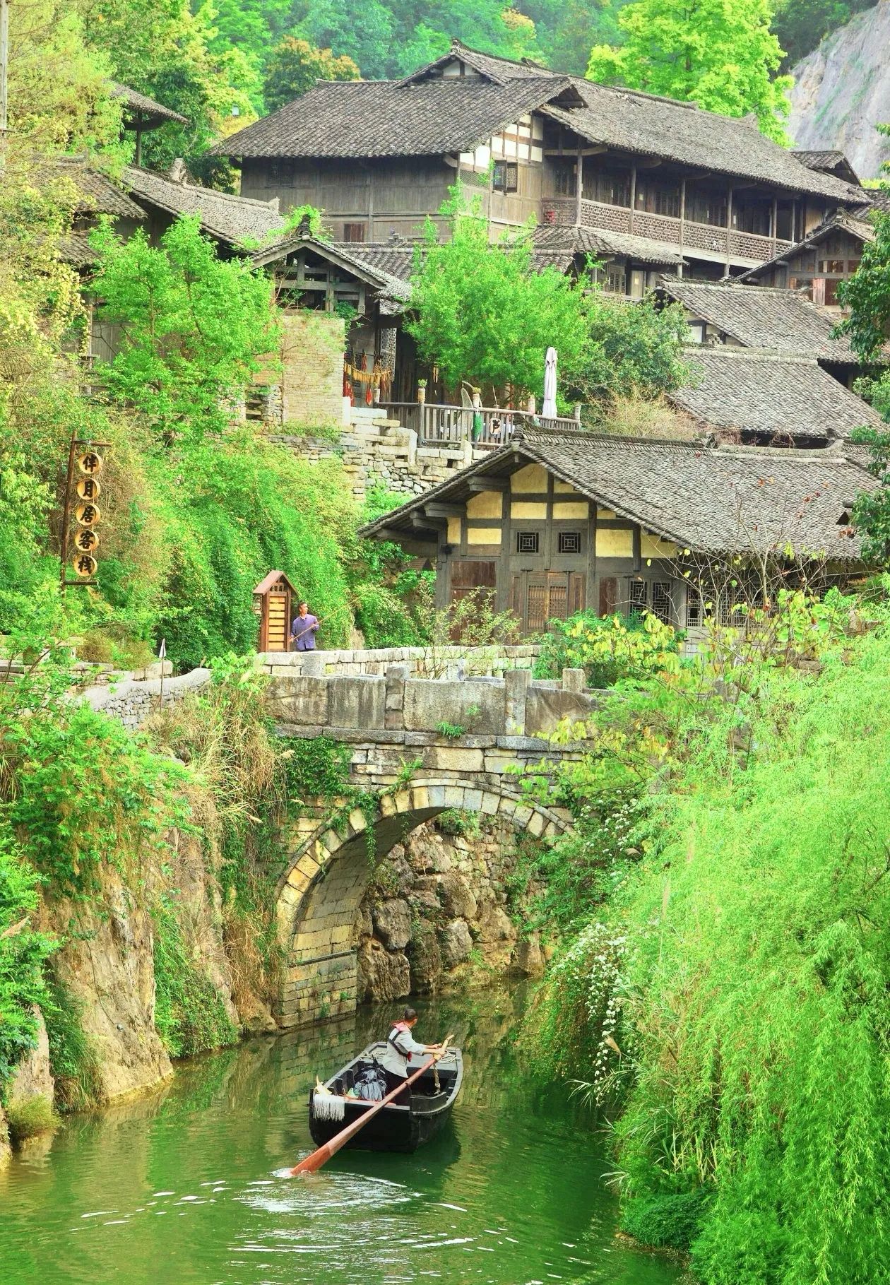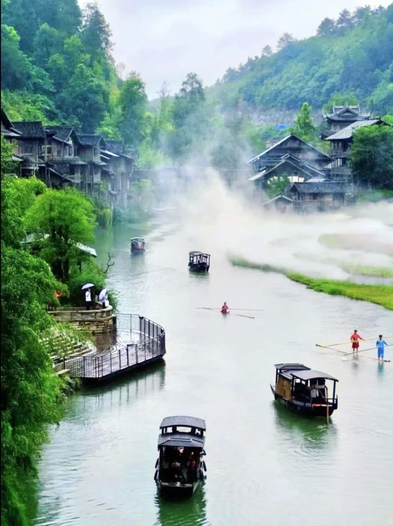 乌江寨名字听起来原生态,其实建筑是纯现代的。青石黛瓦、石板小巷,都是仿古建筑。这里有壮丽的乌江画卷,山林环绕、云烟袅袅、远离尘嚣。坐摇橹船看烟雾弥漫,夜游古村观灯火璀璨,无论是山水之趣,还是文化之韵,都能给人留下难忘的时光。