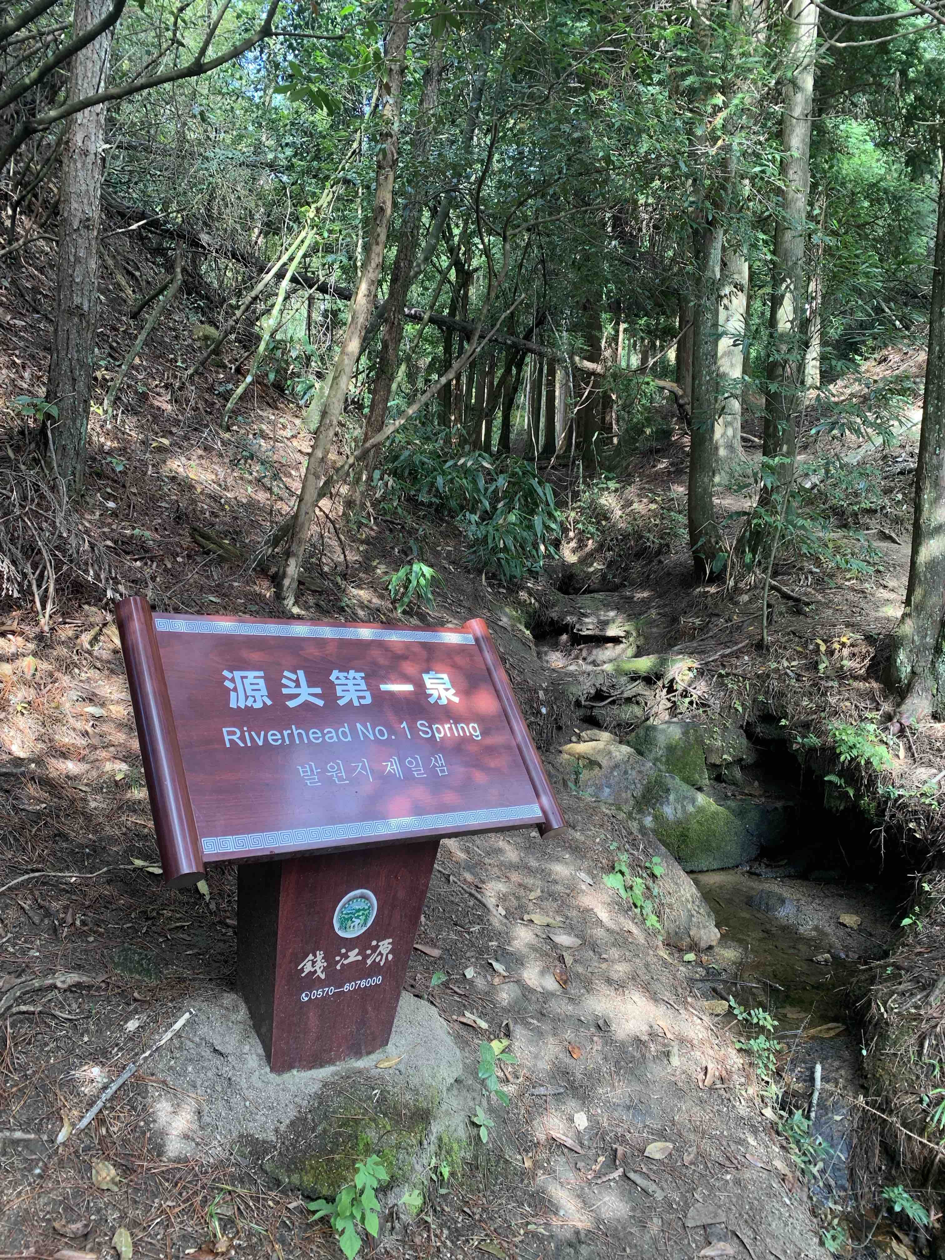 走完百姓云梯不久,就到了“源头第一泉”,此时第一泉几乎没什么水,看了旁边的介绍牌才知道,这条集水溪并不是钱塘江的唯一水源,在群山深处,有无数条的小溪不断流淌,才汇集成了钱塘江。