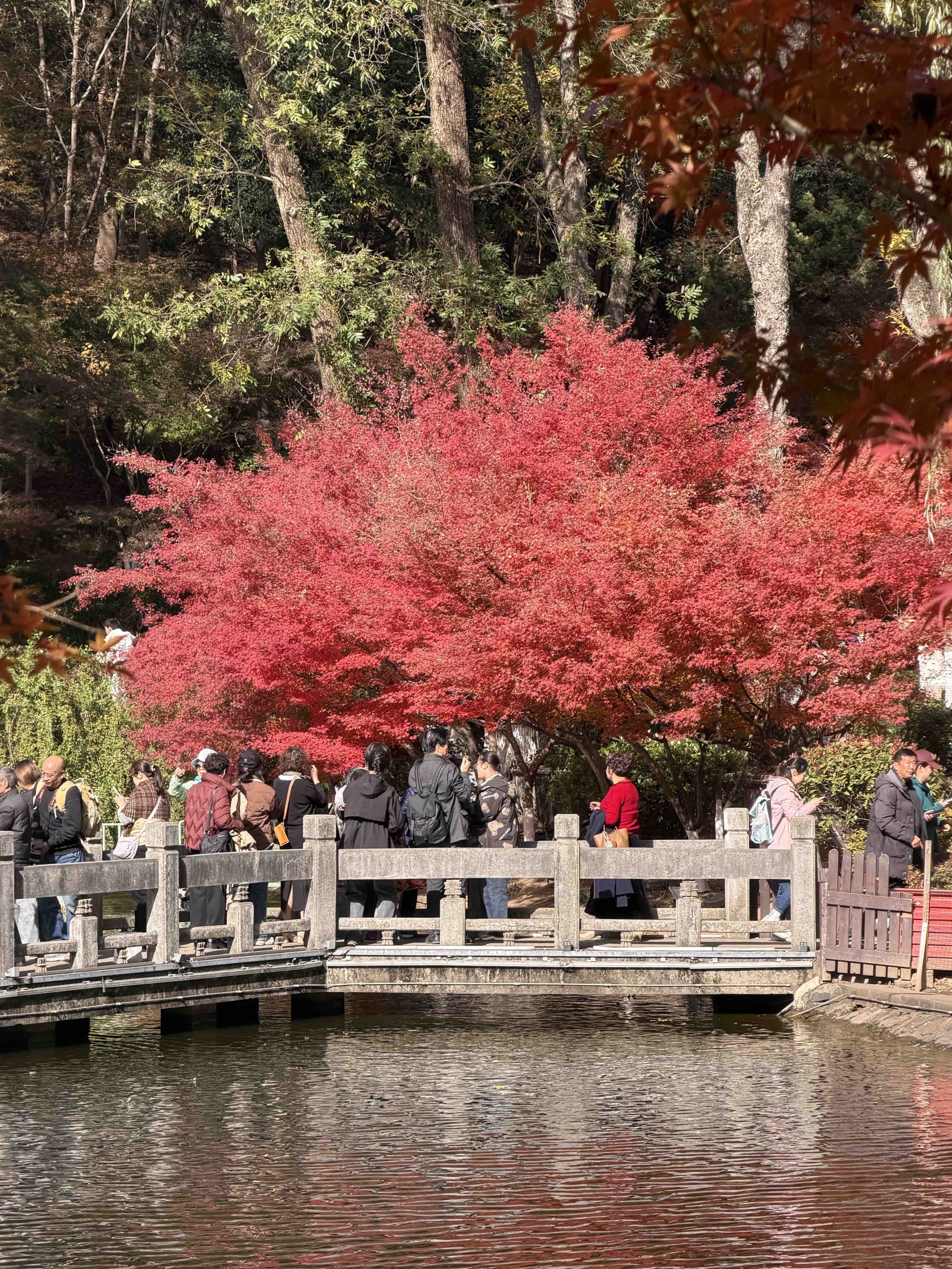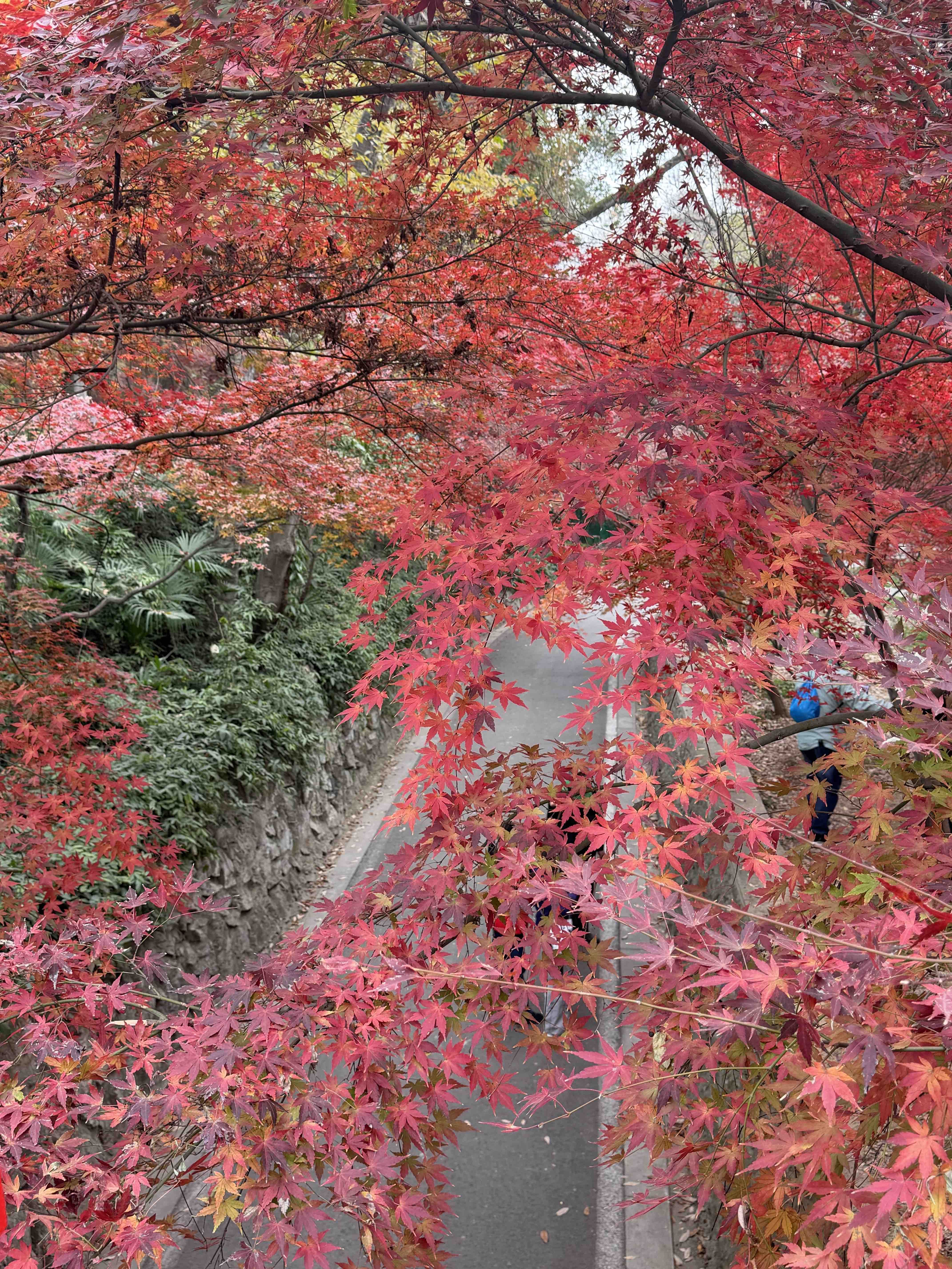 看了栖霞山的风景,你会认为,南京的赏枫可以结束了,原来我也是这样认为的,结果看了中山植物园红枫岗的红枫,才知这想法是大错特错。红枫岗的枫叶不同于栖霞山,她是另一种别样的风景,一大片枫叶集中在山岗上,层次分明,层层叠叠,色彩艳丽,有火红、橙色、绛紫、青色、明黄等,当阳光穿过树叶,一幅五彩斑斓的画卷就出现在你的眼前,如果此时正站在小红桥上,望着桥下川流不息的赏枫人流,你会感叹世上竟有如此美妙的赏枫之地。