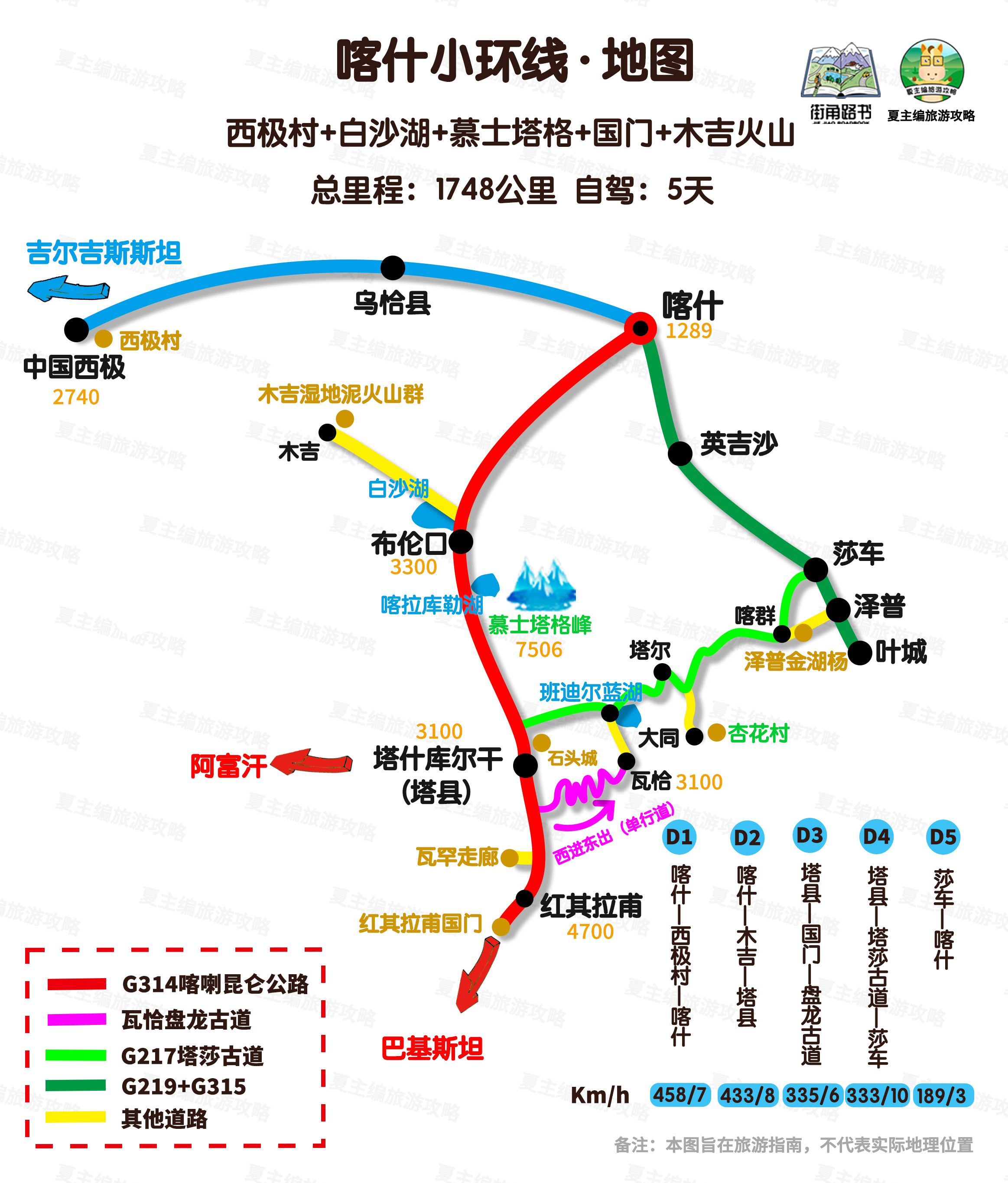 南疆的话,植被资源分布较少,大都是苍茫的戈壁、沙漠、雪山、峡谷等地貌,主要以体验喀什的的建筑、歌舞、工艺、饮食等方面的文化风情,以及喀什周边的西极村、白沙湖、喀拉库勒湖、慕士塔格峰与盘龙古道等景点为主。行程相对简单,具体参考图13的【喀什小环线】即可。