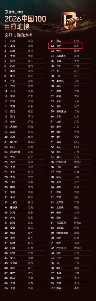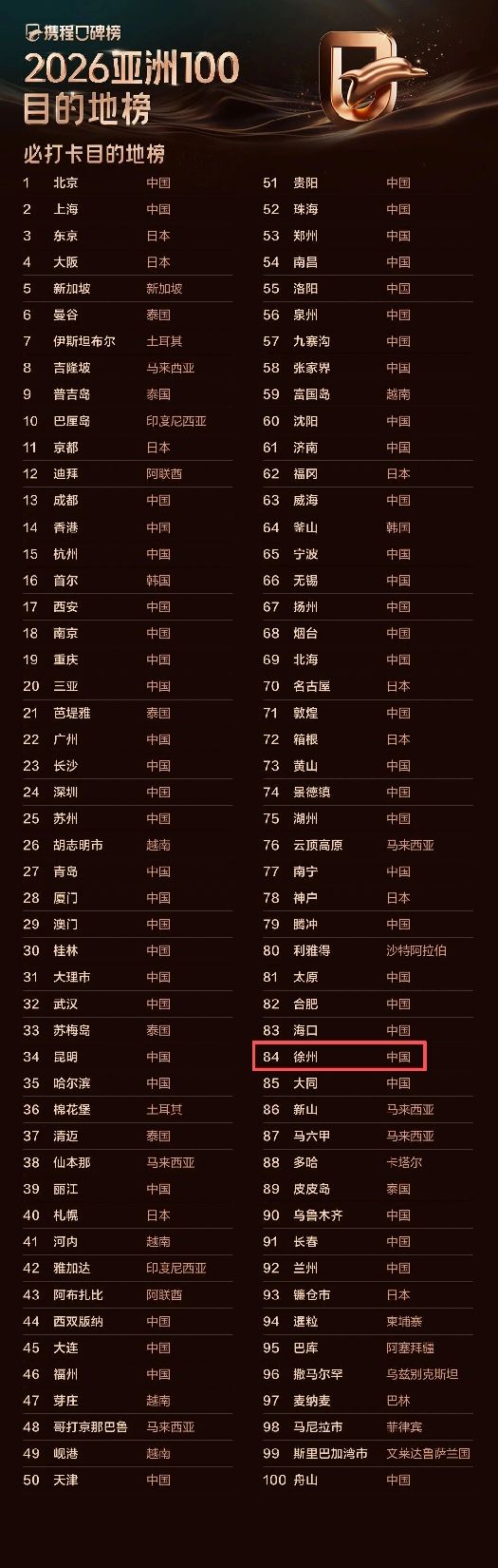 很幸运的是徐州登上了“2026中国100目的地榜”和“2026亚洲100目的地榜”中的必打卡目的地的榜单!