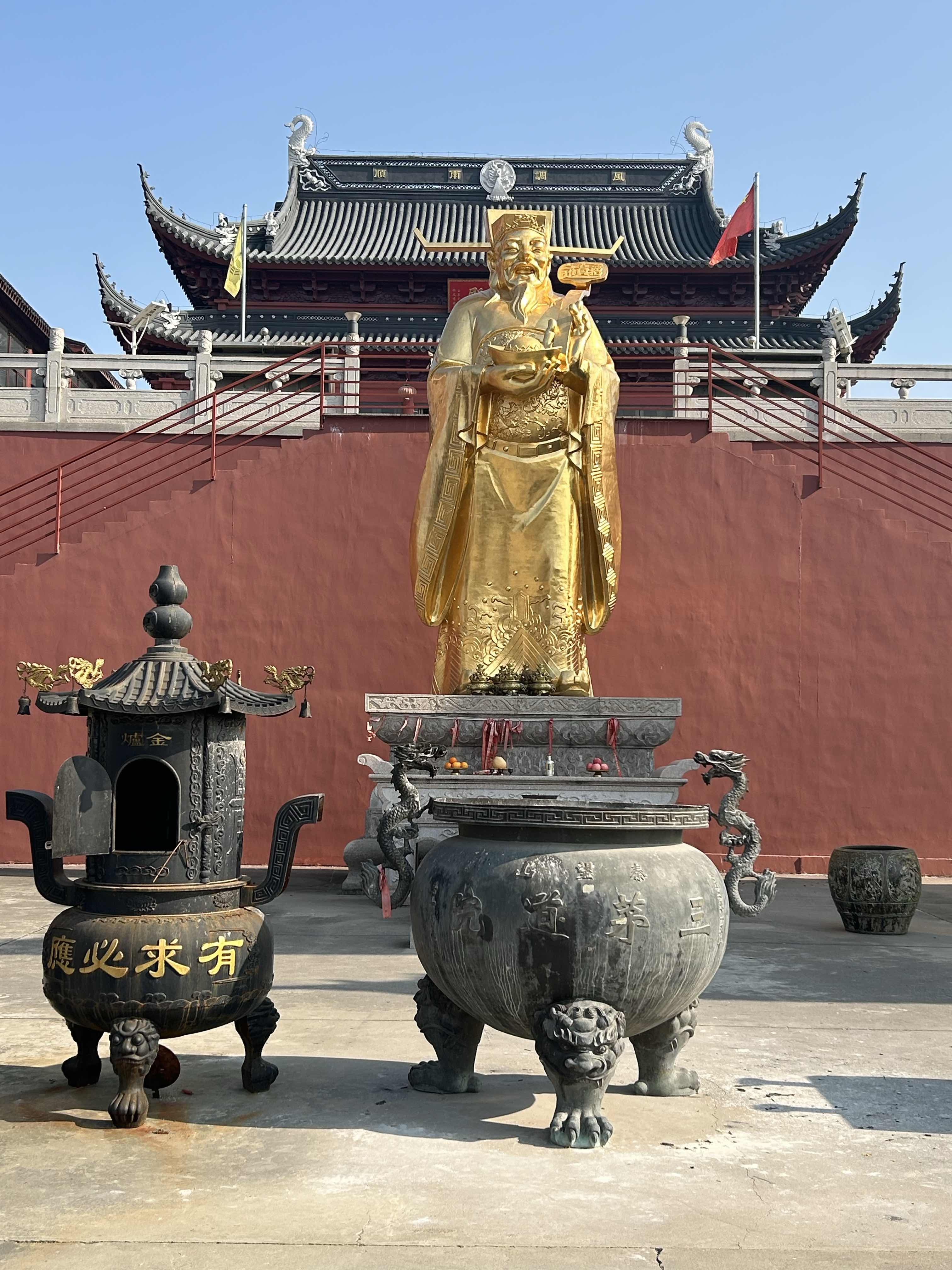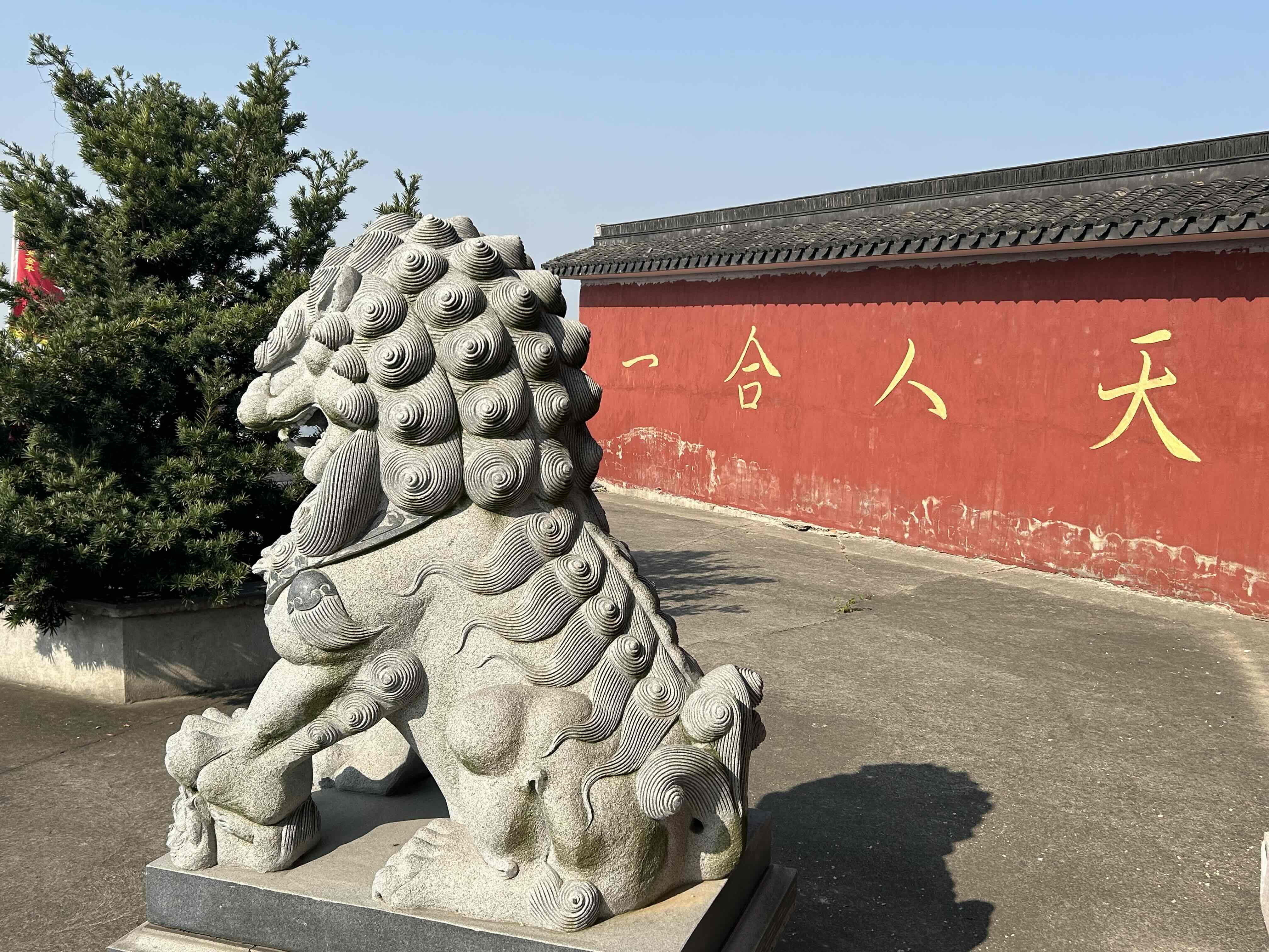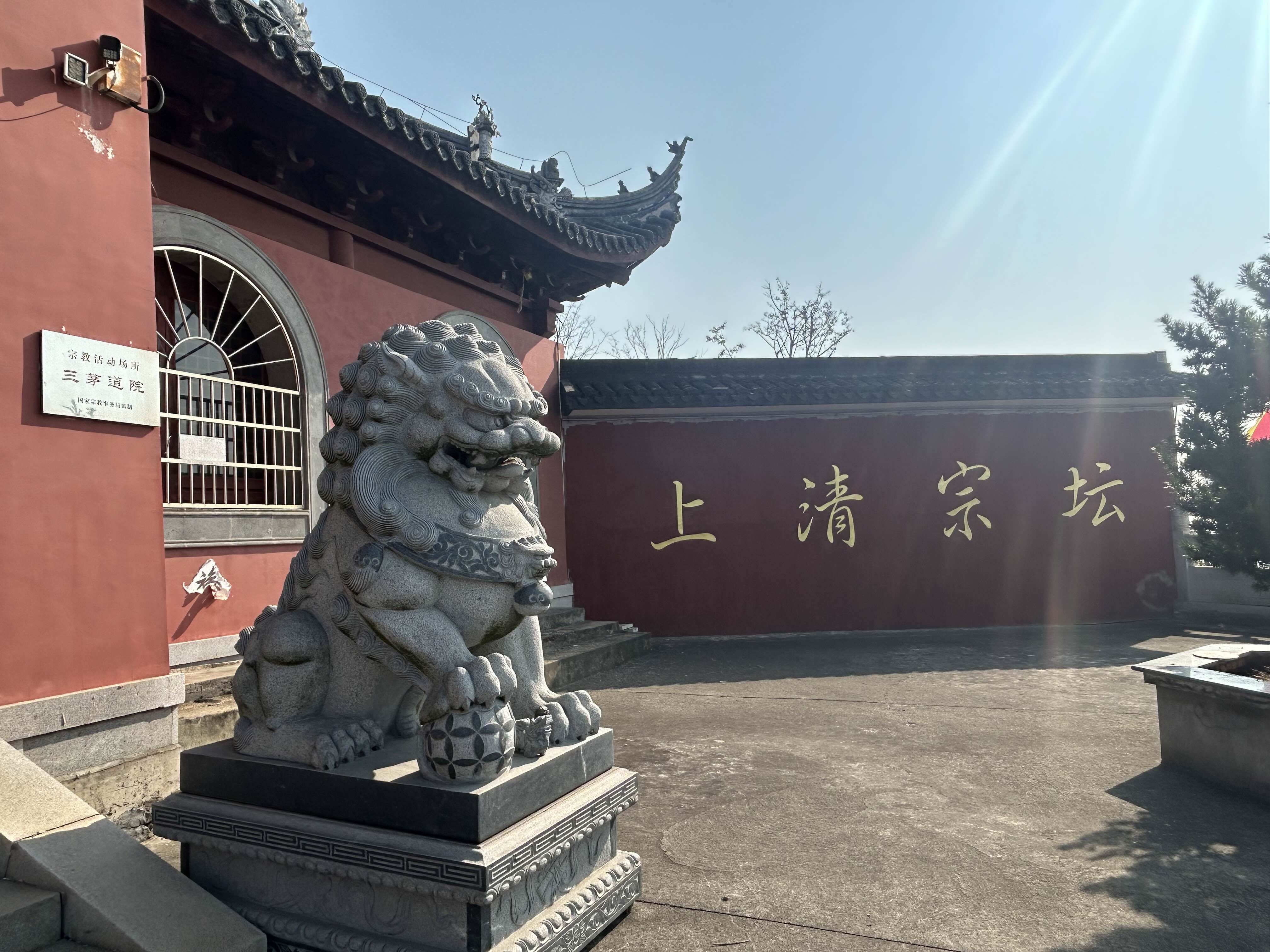 开车到秦望山脚下,登记一下就可上山,无须门票。上山是一条斜坡,也有人开车上山,我是走上去的,走到半山亭子,三茅道院就在眼前。拾级而上走到灵官殿前,殿旁有两面照壁,一面写着“上清宗坛”,一面写着“天人合一”,穿过灵官殿再走上一段台阶,就看见一尊金光闪闪的财神爷,财神爷的左右是钟楼和鼓楼,身后是三茅殿。三茅殿的后面是道院中最高的建筑玉皇殿和三清殿。