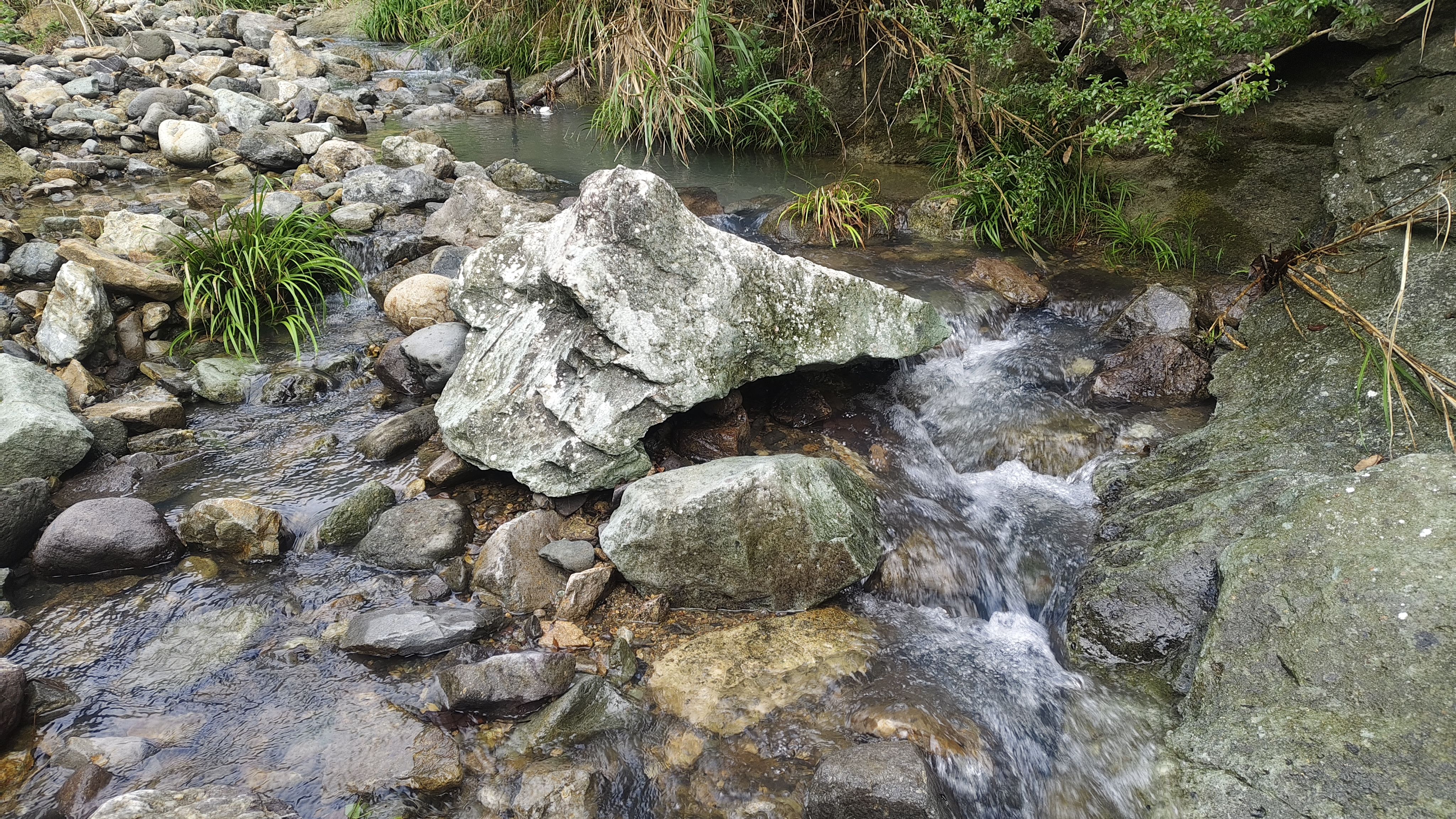 ……时间还早,走到悬崖山脚下,这条小溪。潺潺流水,泉水清澈见底。到了鸟停驻地方,看一下,有什么奇石。小溪里,看见,一块圆圆石头。挺好看的,这是大自然,一件天然作品。把它抱上来,四五十斤重,放到电动车上。带回来了……