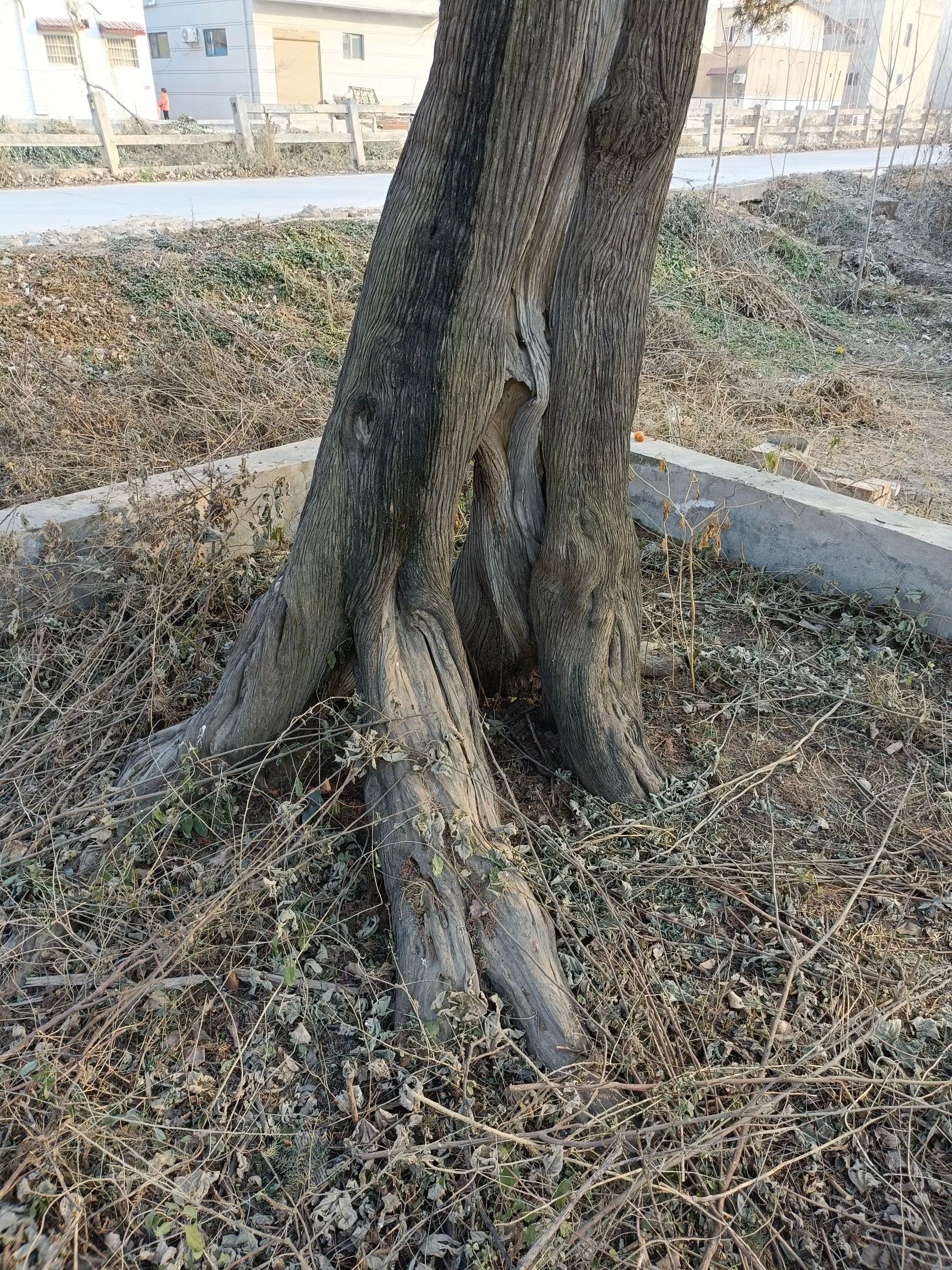 这棵柏树,长势很好,也可能是靠近东边的沟渠,地下水比较丰富,不缺水吧,再加上是一片荒地,长的地方不是多么碍事,所以幸存至今。松柏一般长的很慢,能长的如此粗壮,树形冠幅这么大,确实不容易。它就像一个老者,原地挺立,默然无声,却又深情凝视这片平原沃土,无论战乱水患,历经冰刀雪剑,也许还有火灾的侵袭,依旧生机勃发。