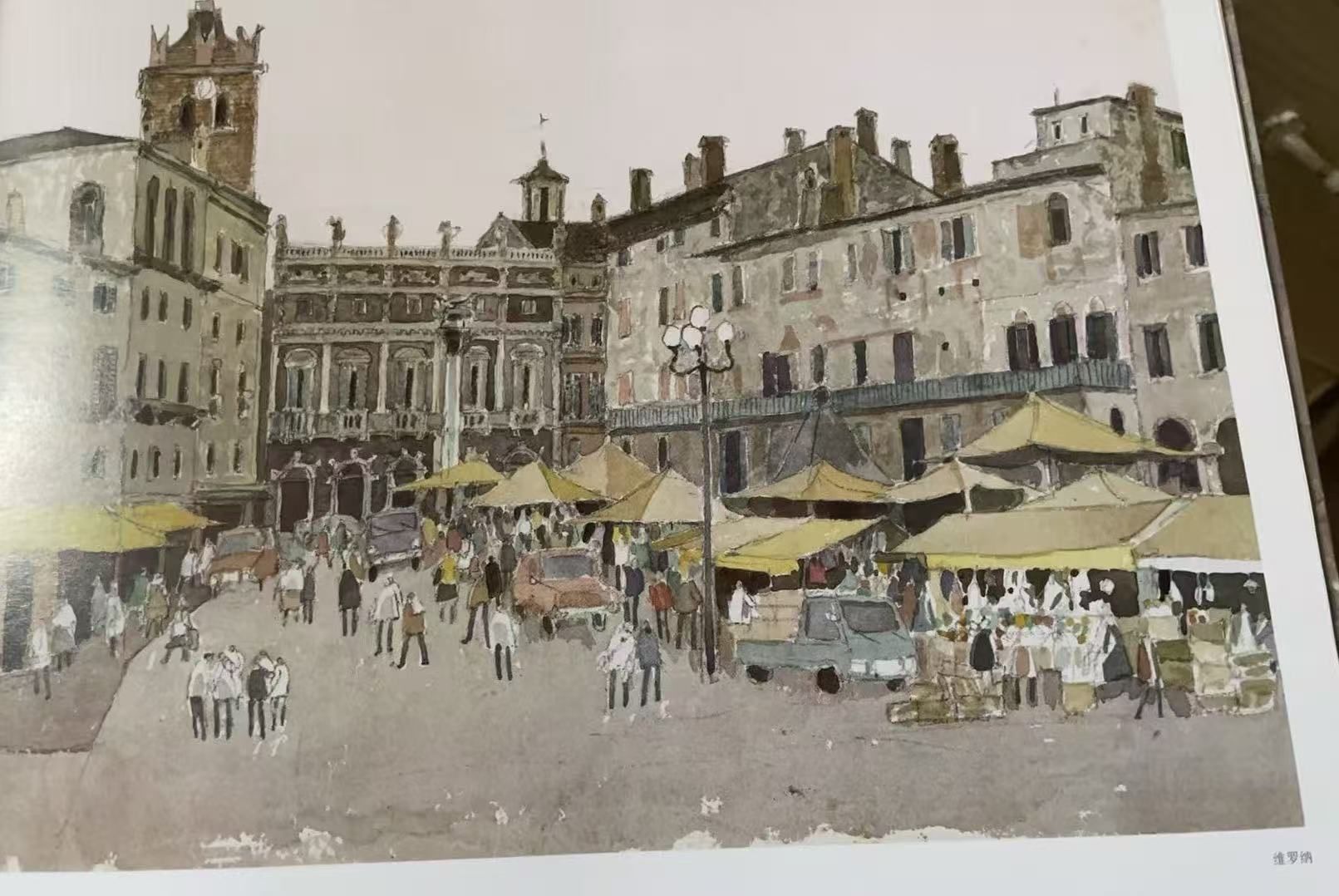 我循着故事中的情节来到领主广场。广场被旧市政厅、朗贝尔蒂塔、拱形回廊、商人法庭包围,它们都是文艺复兴时代的宏伟建筑。清晨,广场上有繁华的早市。随着时间逐渐接近中午,人流开始散去,早市的摊位陆续收拾离开,广场上又变得空空如也,回归平静。但在我的画中,在我的脑海中,罗密欧正拔剑准备开始搏斗。摘自(我眼中的美丽世界意大利)一书