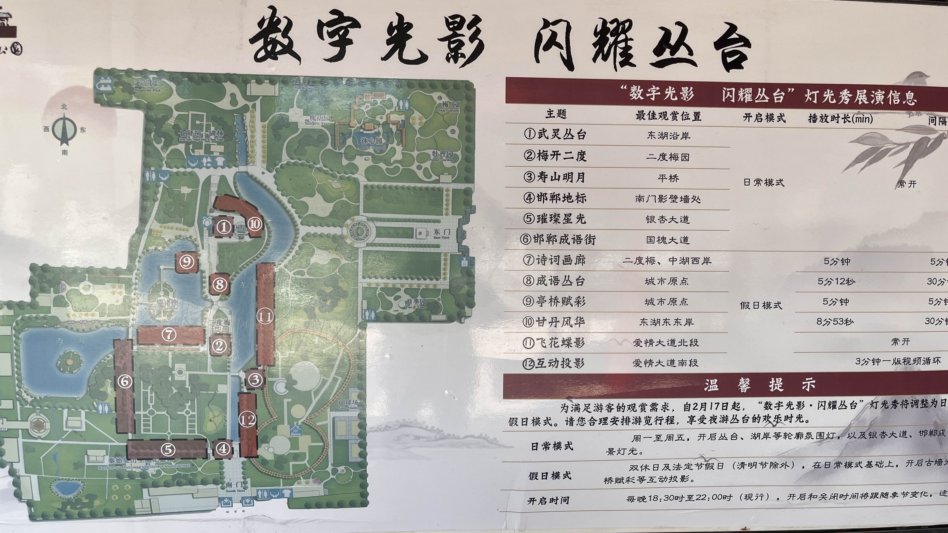 第三天,由于昨天我们走的路太多了,今天睡到了自然醒,起来的时候都9点多了,从酒店出来的时候已经是10点多了,我们就决定吃一个早午饭,听说磁州卤面是当地特色饭店,我们就去了邯郸道一家磁州卤面分店去尝尝,到店后,我们点了两碗面,一个是牛肉面,一个是排骨面,还点了邯郸焖子和炸灌肠,吃完后开始了我们今天的打卡景点-丛台公园。据说丛台公园老早之前是要票的,现在免票了。丛台公园可不是一座普通的公园,它有着2000多年的历史,这座公园以武灵丛台而闻名天下。武灵丛台,相传建于赵国五灵王时期,是赵王检阅军队和观赏歌舞的地方,已有2000多年的历史。我们登上丛台后可以看到丛台公园的全貌,丛台上有乾隆皇帝和郭沫若的题词碑,丛台上还有一个武灵旧馆,游客们可以了解赵武灵王平生事迹,只可惜这位拓土阔疆英王就惨死于一场内乱中,自己也被困于沙丘宫,凄惨地死去。