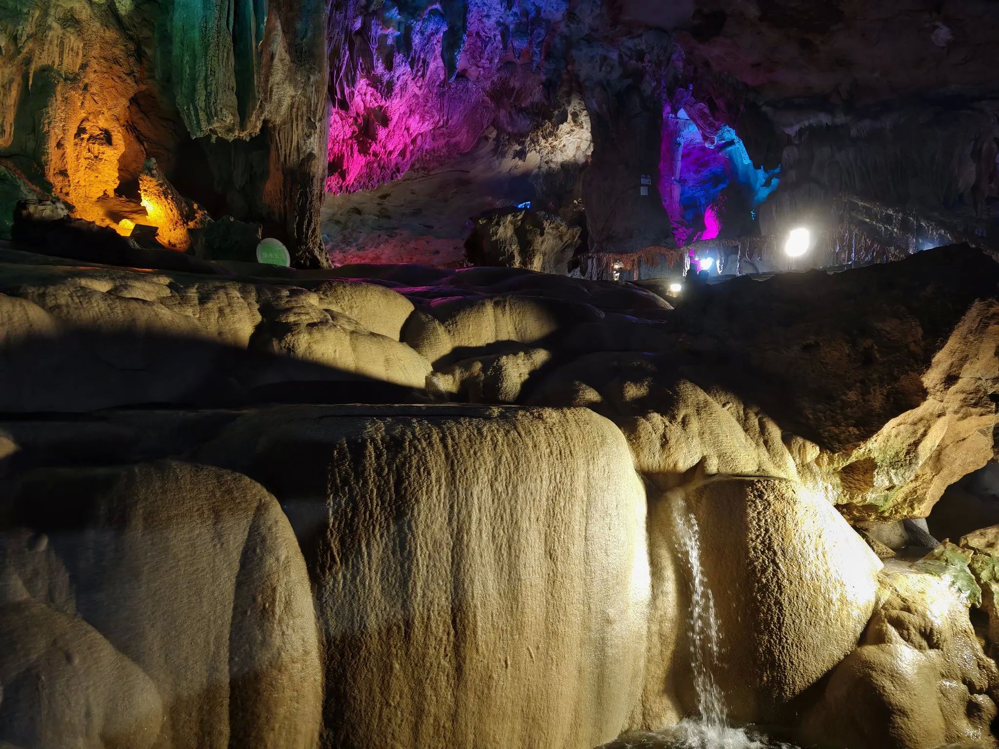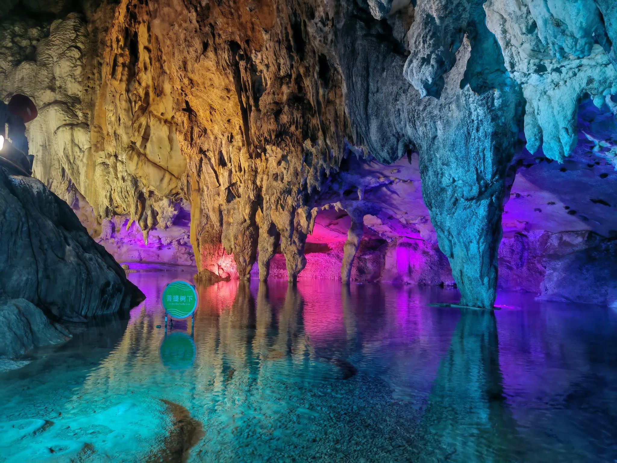 离开大石围天坑,我来到了逻妹莲花洞。一进入洞中,仿佛置身于一个梦幻般的水晶世界。洞内的钟乳石和石笋在灯光的映照下,呈现出五彩斑斓的色彩,有的像盛开的莲花,有的似倒挂的冰锥,有的如巨大的石柱,形态万千,栩栩如生。洞中的石幔、石瀑层层叠叠,在灯光的照射下,散发出柔和的光芒,宛如仙女的裙摆,轻盈飘逸。洞中还有一条蜿蜒的地下暗河,河水清澈见底,在灯光的映照下,波光粼粼,仿佛一条银色的丝带,为整个洞穴增添了一份灵动之美。