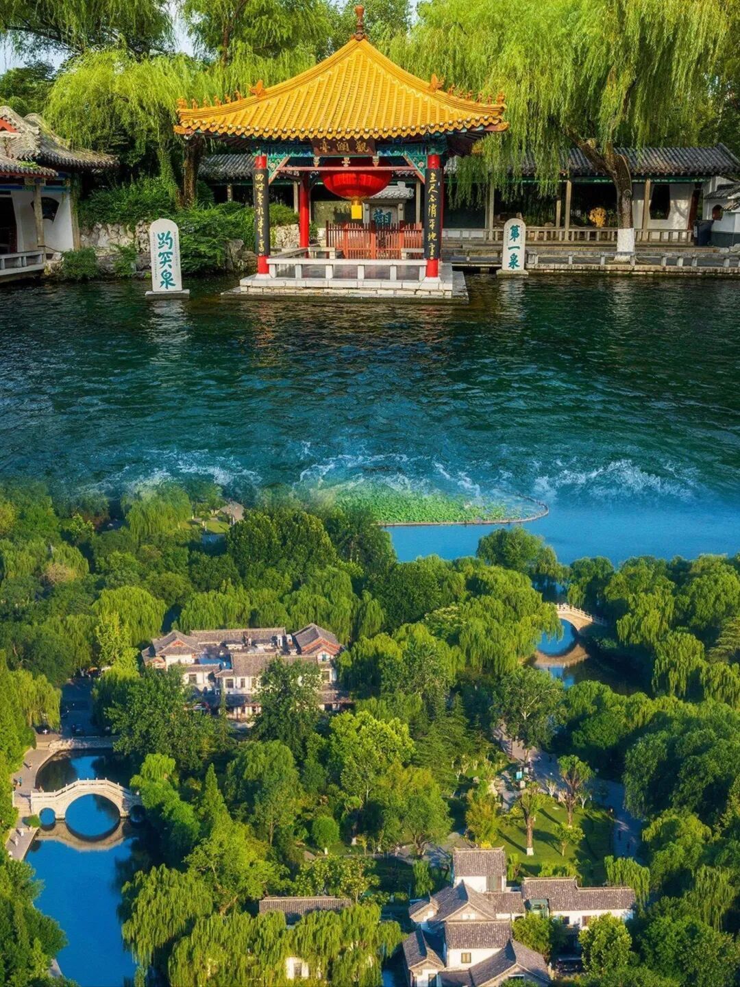 天下第一泉,三股泉水终年喷涌不息,水质清澈见底,园区内亭台楼阁,非常适合拍照留念。