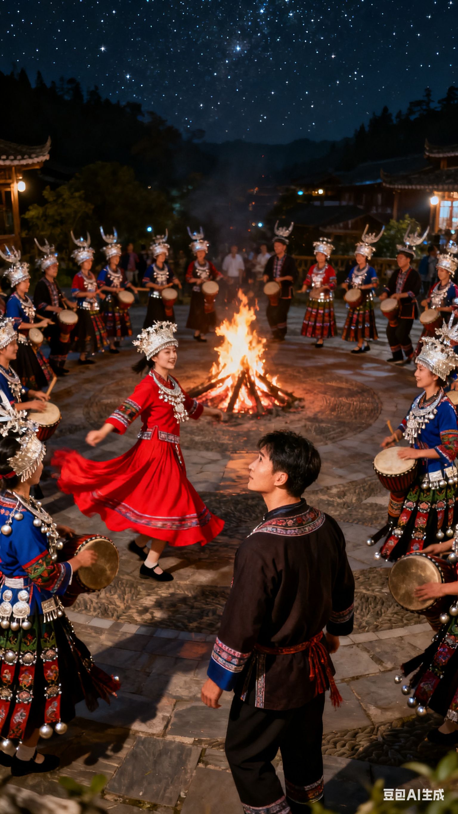 沿白水河前行,忽见一群苗女身着盛装,银冠银角熠熠生辉,正在跳铜鼓舞。鼓点铿锵,舞步轻盈,银饰叮当声震山谷。红凤看得入迷,轻声吟道:“铜鼓声声震碧霄,苗家儿女舞姿娇。银冠闪烁惊鸿起,醉里东风拂鬓腰。”道龙凝视鼓面,只见纹饰古朴,似有龙纹隐现,随口和之:“鼓点沉沉诉古今,苗疆儿女赤诚心。银铃摇落千年韵,一曲欢歌动客襟。”