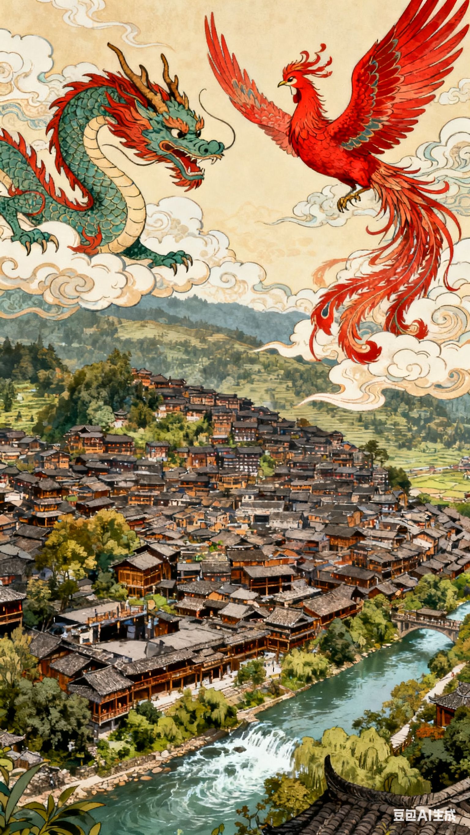 踏云逐风越黔岭,苗疆深处隐桃源。无双道龙执玄铁笔,祥瑞红凤携丹霞卷,自九天垂降西江千户苗寨。时维孟秋,雾锁青山如黛,露濡梯田似镜,白水河如玉带穿寨,吊脚楼依山叠翠,六千苗胞在此繁衍生息,九成九皆为苗族后裔,十余个自然村寨连绵成势,不愧“天下第一苗寨”之誉。道龙立寨门远眺,只见重峦叠嶂直插苍穹,吊脚楼层层叠叠如蜂房蚁穴,银饰叮当与芦笙声交织,遂与红凤相视而笑:“此乃人间仙境,当以诗为证,以墨为记。”